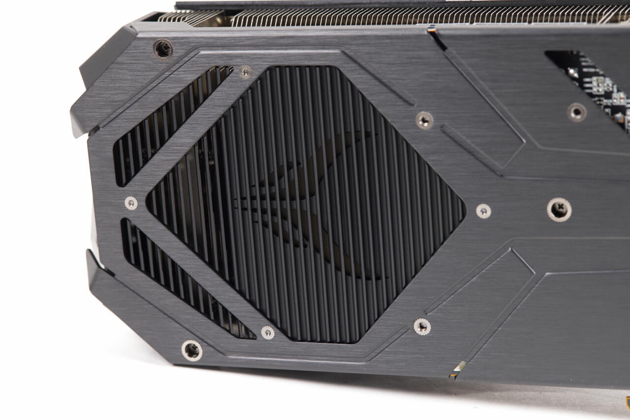 Besonders hervorzuheben ist die Backplate, die eine Aussparung aufweist, die für eine zusätzliche Wärmeableitung sorgt. Diesen Trend sehen wir bei fast allen Grafikkarten auf dem Markt. Die Metallbackplate ist schick verziert und man sieht in den Schlitzen, die auch komplett schwarz lackiert sind, das Red Devil Logo herausstechen, jedoch nur in bestimmten Blickwinkeln. Einzig die nicht schwarz lackierte Backplate der GPU-Halterung fällt auf und stimmt nicht mit dem Rest des Designs überein.