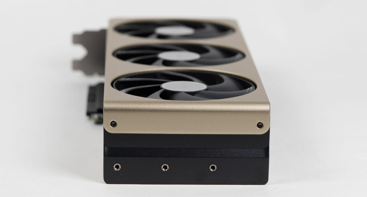 Entsprechend sehen wir auf der Rückseite einen Ausschnitt in der Backplate. MSI hat rechteckige Ausschnitte aus der Alu‑Backplate gestanzt, die das Design etwas auflockern sollen. Ansonsten ist das Design sehr sauber und minimalistisch. Die Lackierung hat einen goldenen Touch und sieht sehr wertig aus. Der MSI‑ und GeForce RTX‑Schriftzug ist jeweils in Schwarz aufgedruckt und passt zum Gesamtbild.