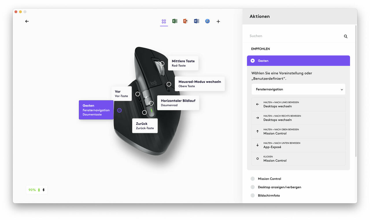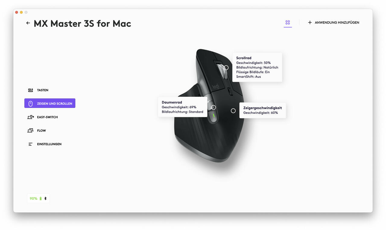 Mit der Logi Options+ Software lässt sich die MX Master 3S individuell anpassen. Die Benutzeroberfläche ist übersichtlich gestaltet und macht es einfach, Tasten neu zu belegen oder Funktionen für macOS zu aktivieren. Besonders praktisch ist die Möglichkeit, Profile für verschiedene Programme zu erstellen. So kann beispielsweise die Maus in Programmen wie Photoshop, Final Cut Pro oder Safari unterschiedlich angepasst und eingestellt werden.