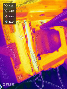 Die verchromten Teile an der Seite dienen auch der Kühlung. Der Übergang wird über Wärmeleitpads realisiert und 1-mm dicke Wärmespreitzer gibt dann die Abwärme über eine größere Fläche ab. Der RAM wird unter last dadurch nicht besonders heiß und erreicht laut Wärmebildkameraaufnahmen ca 48 °C. Insgesamt also ein guter Wert für die Kühlung.