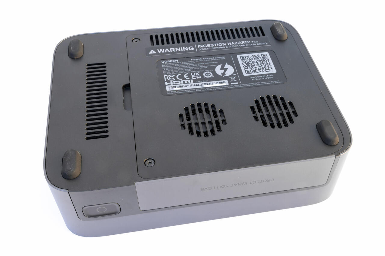 Das Gerät besitzt auf der Unterseite vier gummierte Füße die dafür sorgen, dass das NAS sicher auf dem Tisch steht und gleichzeitig Vibrationen gedämpft werden. So bleibt es nicht nur stabil, sondern läuft auch ruhig. Zudem befinden sich insgesamt drei Lüfter im Gerät, wobei zwei davon durch die Öffnung sichtbar sind. Das Öffnen der Klappe gelingt durch Lösen von wenigen Schrauben. Sobald die Abdeckung abgenommen ist, offenbart sich das Innere des Geräts, das die Slots für bis zu vier M.2 NVMe-SSDs beherbergt.