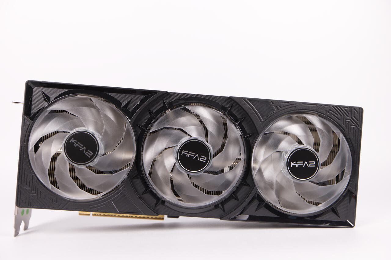 Um das zurückhaltende Design aufzulockern, hat KFA2 ARGB-Beleuchtung in weiße Seitenstreifen entlang der Karte integriert, die eine anpassbare Beleuchtung bieten und die optische Wirkung dynamisch verstärken, ohne die schlanke Form zu überladen. Das Branding bleibt minimalistisch und kennzeichnet die Karte eindeutig als Teil der GeForce RTX-Reihe von NVIDIA, wobei jedoch die spezifische Modellbezeichnung bewusst weggelassen wurde.