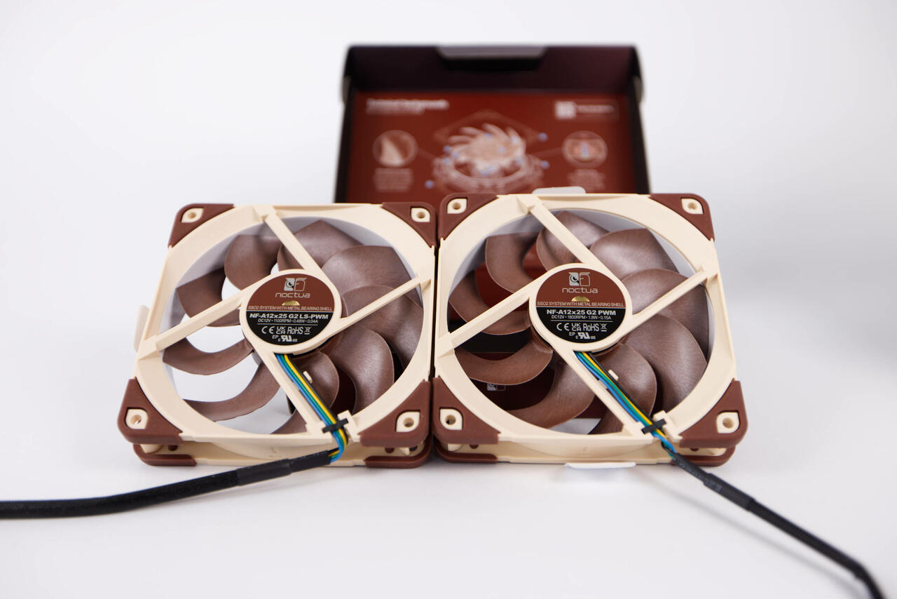 Noctua verkauft die Lüfter auch als Doppelpak mit der Kennung NF-A12x25 G2 PWM Sx2-PP. Die Verpackung ist dann doppelt so breit, sieht aber ansonsten sehr ähnlich aus.