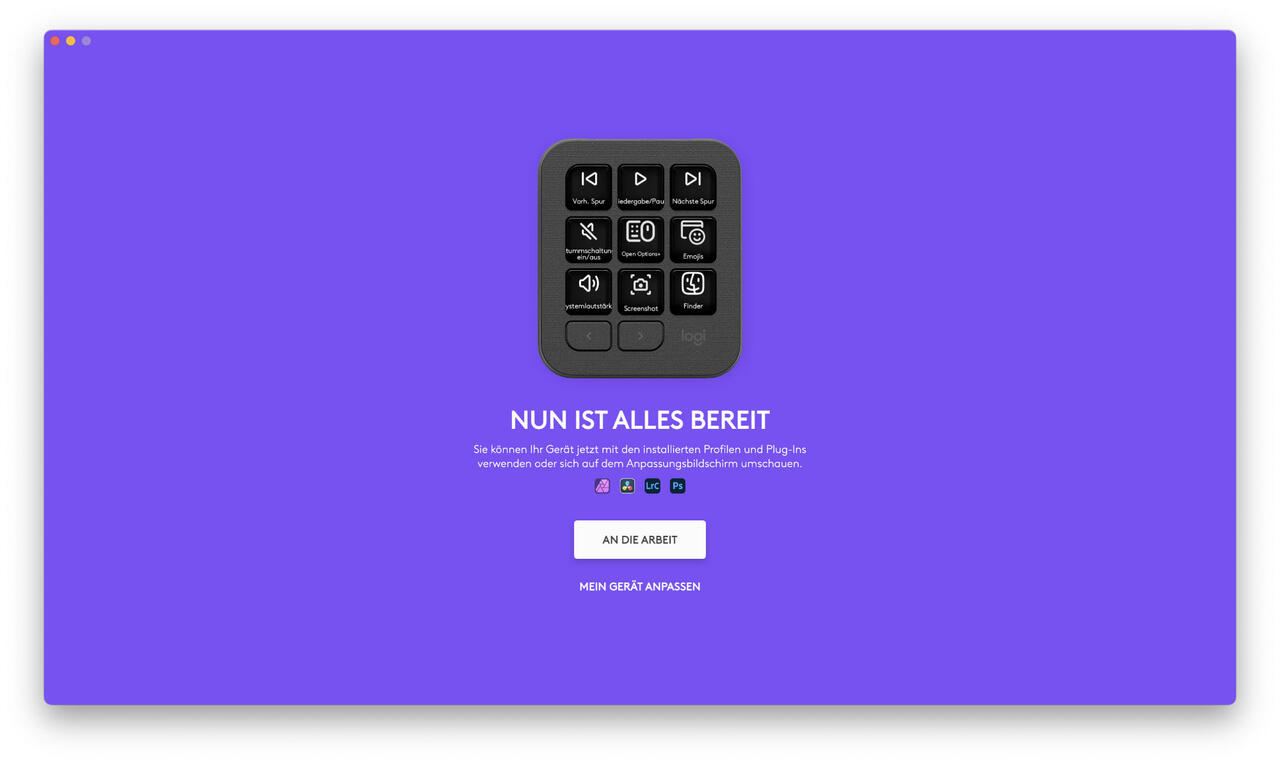 Wer die MX Creative Console wirklich ausreizen möchte, braucht Logi Options+. Die Software ist das Herzstück des Systems und macht aus den beiden Modulen weit mehr als nur hübsche Eingabegeräte. Schon beim ersten Start überzeugt sie mit einer modernen, klar strukturierten Oberfläche, in der man sich schnell zurechtfindet. Ein Assistent führt durch die Einrichtung und installiert auf Wunsch direkt passende Profile für unterstützte Programme.