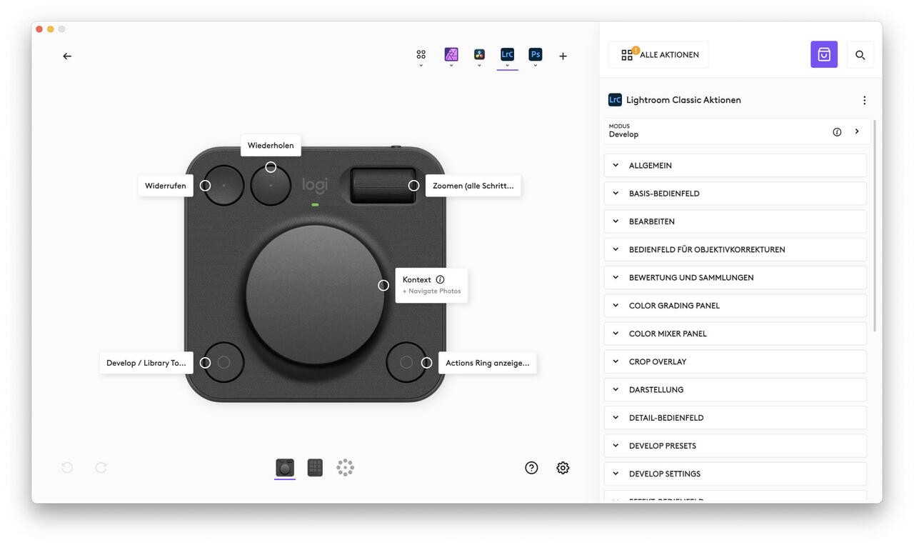 Am Beispiel von Lightroom Classic zeigt sich gut, was mit der MX Creative Console möglich ist. Nach dem Start des Programms wechselt die Konsole automatisch auf das passende Profil und auf dem Keypad stehen uns direkt nützliche Funktionen zur Verfügung. Wir können Bilder rotieren, Sterne vergeben (1, 3 oder 5 Sterne sind voreingestellt), Fotos markieren oder ablehnen und sogar Farbbewertungen oder den Export-Dialog mit einem Tastendruck aufrufen. Am Dialpad blättern wir mit dem großen Drehregler durch unsere Aufnahmen. Über den Action Ring, den wir mit der unteren rechten Taste öffnen, lassen sich Parameter wie Temperatur, Lichter, Schwarzwerte oder Tiefen direkt und präzise anpassen. Das funktioniert erstaunlich intuitiv und spart gerade bei längeren Bearbeitungssessions spürbar Zeit. Und das Gute ist, dass wir alles individuell ändern können.