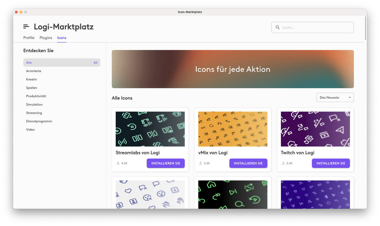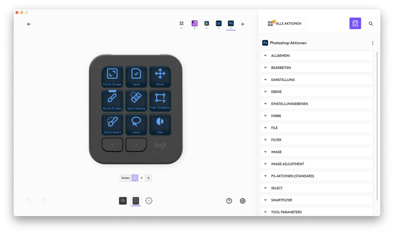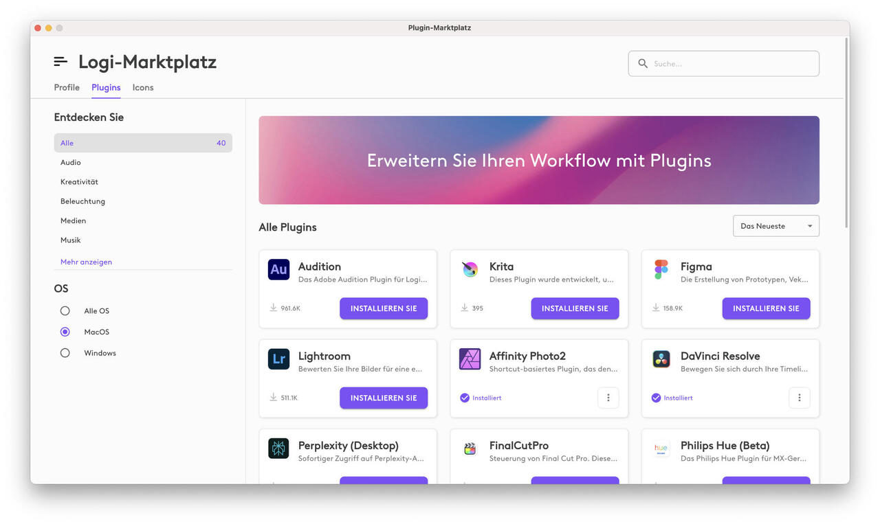 App-Integrationen | Adobe Lightroom, Adobe Lightroom Classic, Adobe Photoshop, Adobe Premiere Pro, Adobe After Effects, Adobe Audition, Adobe Illustrator, Final Cut Pro, DaVinci Resolve, Figma, Affinity Photo, Zoom, Spotify, Microsoft Teams.Weitere Plugins im Logi Marketplace. |