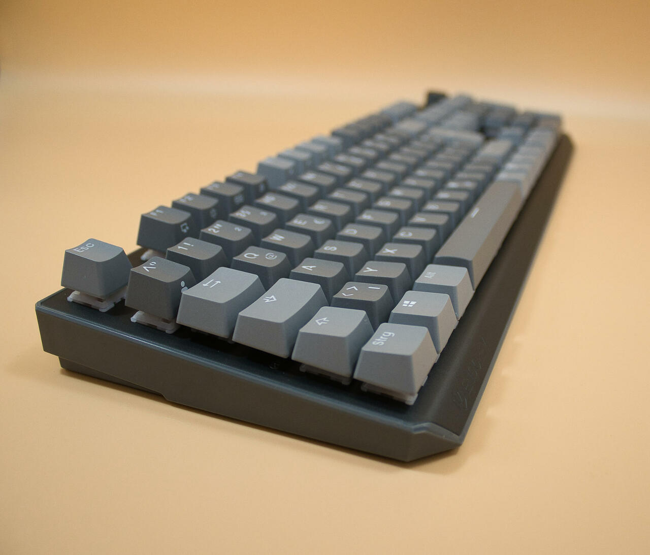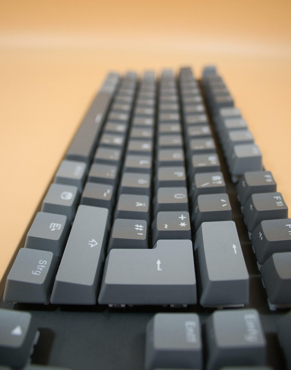 Die Tastatur ist durch den Ziffernblock auch sehr gut zum Bearbeiten von Exeltabellen o.ä. zu benutzen, was beim Fehlen den meisten erst auffällt. Die PBT-Tastenkappen sind gut geformt und die Fingerkuppen haben einen sehr guten halt beim Schreiben. Insgesamt eine tolle Schreibmaschine welche für 66€ einen guten Job abliefert und sich vor teureren Vertretern nicht verstecken muss. Die Lautstärke ist dabei recht angenehm, man muss sich allerdings erstmal an den etwas dumpferen, recht lauten Ton gewöhnen. Wer sich ein wenig anstrengt, kann durch leichteres betätigen sogar fast lautlos schreiben. Was uns gut gefallen hat, dass alle Tasten ein ähnliches Geräusch von sich geben, andere Vertreter haben des Öfteren Probleme beim Betätigen der Leertaste oder der Entertaste, dass diese sich „falsch“ anhören.