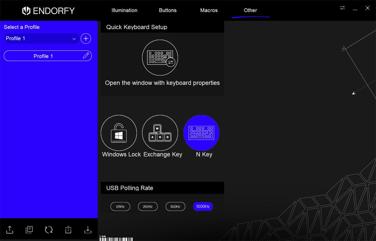 Unter dem Letzten Punkt „Other“ können dann Tastatur spezifische Optionen im Detail eingestellt werden, von der Polling rate bis zur Windowsbutton Deaktivierung kann hier konfiguriert werden. Alles in allem ist die Software gut aufgebaut und bietet einen recht stylischen Auftritt.