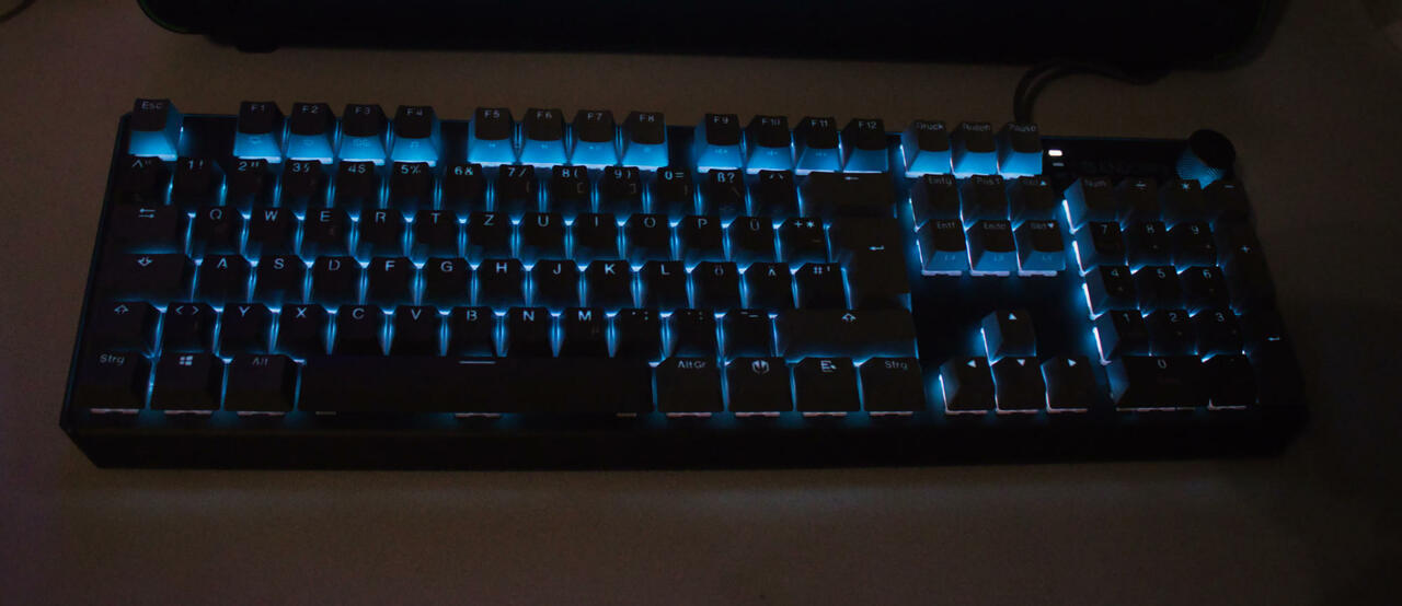 Dafür ist Beleuchtung um jede Taste sichtbar und kann per Software konfiguriert werden. Auch die Buchstaben werden durchleuchtet, so dass diese einen dezenten Glow haben. Es können verschiedene Muster konfiguriert werden oder auch eine Auslösung per Tastendruck ist möglich. Wer es wild haben will der kann ne kleine Disco konfigurieren. Allerdings ist eine solche Konfiguration dann auch schnell ablenkend aber auch ein kleiner „Eyecatcher“. Die Beleuchtung ist dabei sehr gut verteilt, einzig die Leertaste hat nur eine LED spendiert bekommen und dadurch werden die darüber liegenden Buchstaben nicht komplett angestrahlt und es entsteht ein kleiner Stilbruch, welcher allerdings im Alltag kaum auffällt.