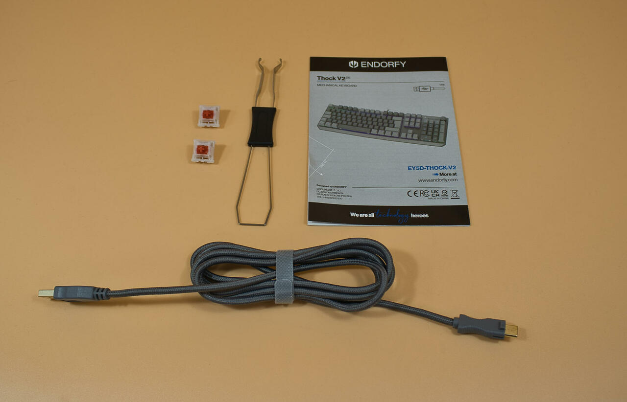 Im Lieferumfang liegt die Tastatur, ein 1,8 Meter langes, grau ummanteltes USB-A auf USB-C Kabel, eine Kurzanleitung, zwei Ersatzswitches und zwei Werkzeuge bei, wobei sich eins an der Unterseite der Tastatur befindet. Wir haben nichts am Lieferumfang auszusetzen.