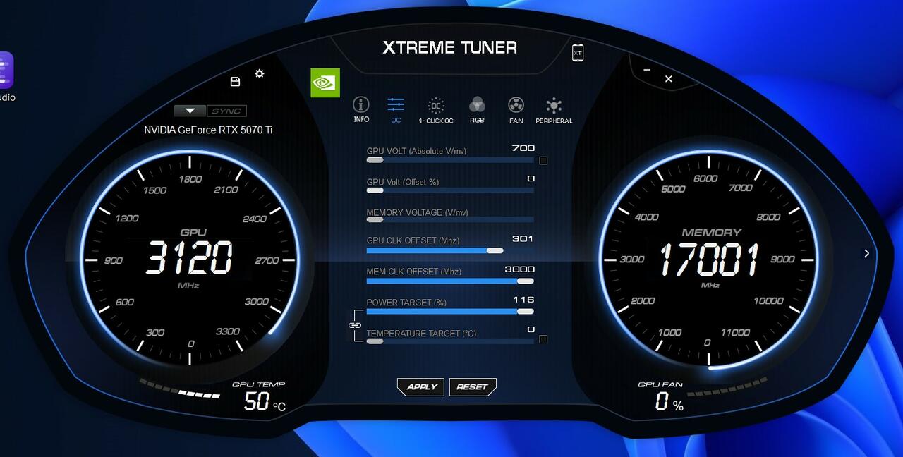 Die GeForce RTX 5070 Ti HOF und generell die HOF-Serie von KFA2 ist für Übertaktung ausgelegt. Deswegen haben wir die Grafikkarte mithilfe des KFA2 XTREME Tuner PLUS Tools übertaktet und geschaut, wie viel mit den Standardmitteln möglich waren. Das Tool ist aber seit Monaten nicht aktualisiert worden und übernimmt noch immer keine TBP-Änderungen, auch wenn es sie ließt. Dafür mussten wir dann erst den Afterburner nutzen, um die TBP anzuheben und dann die Taktraten in XTREME Tuner PLUS anzupassen. Die GDDR7-Übertaktung geht bis 3.000 Mhz, was MSI Afterburner nicht schafft. Das gibt uns mehr Spielraum.