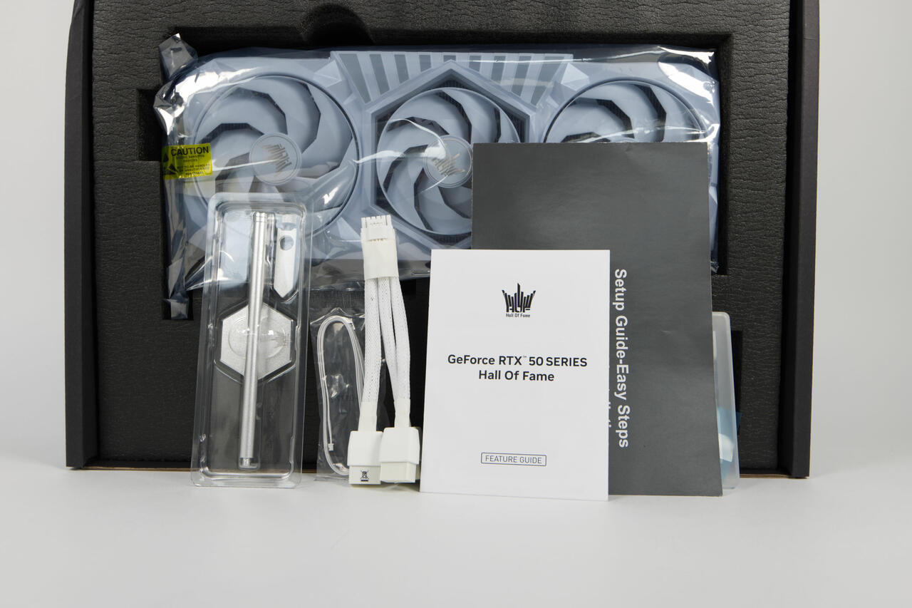 Der Lierumfang beinhaltet mehr als nur die Grafikkarte. Wir finden hier wir eine robuste Halterung, die ein Durchhängen der Grafikakrte in größeren Gehäusen verhindert und erst zusammengebaut werden muss. Ebenfalls enthalten sind ein simples Handbuch, ein 12V-2x6-Adapter auf 3x8-pin-PCIe-Stromstecker und das ARGB-Beleuchtungskabel, das zur Synchronisation der Beleuchtung der Grafikkarte und anderen Beleuchtungssystemen ermöglicht. Alles ist dabei in weiß gehalten, passend zur Grafikkarte.