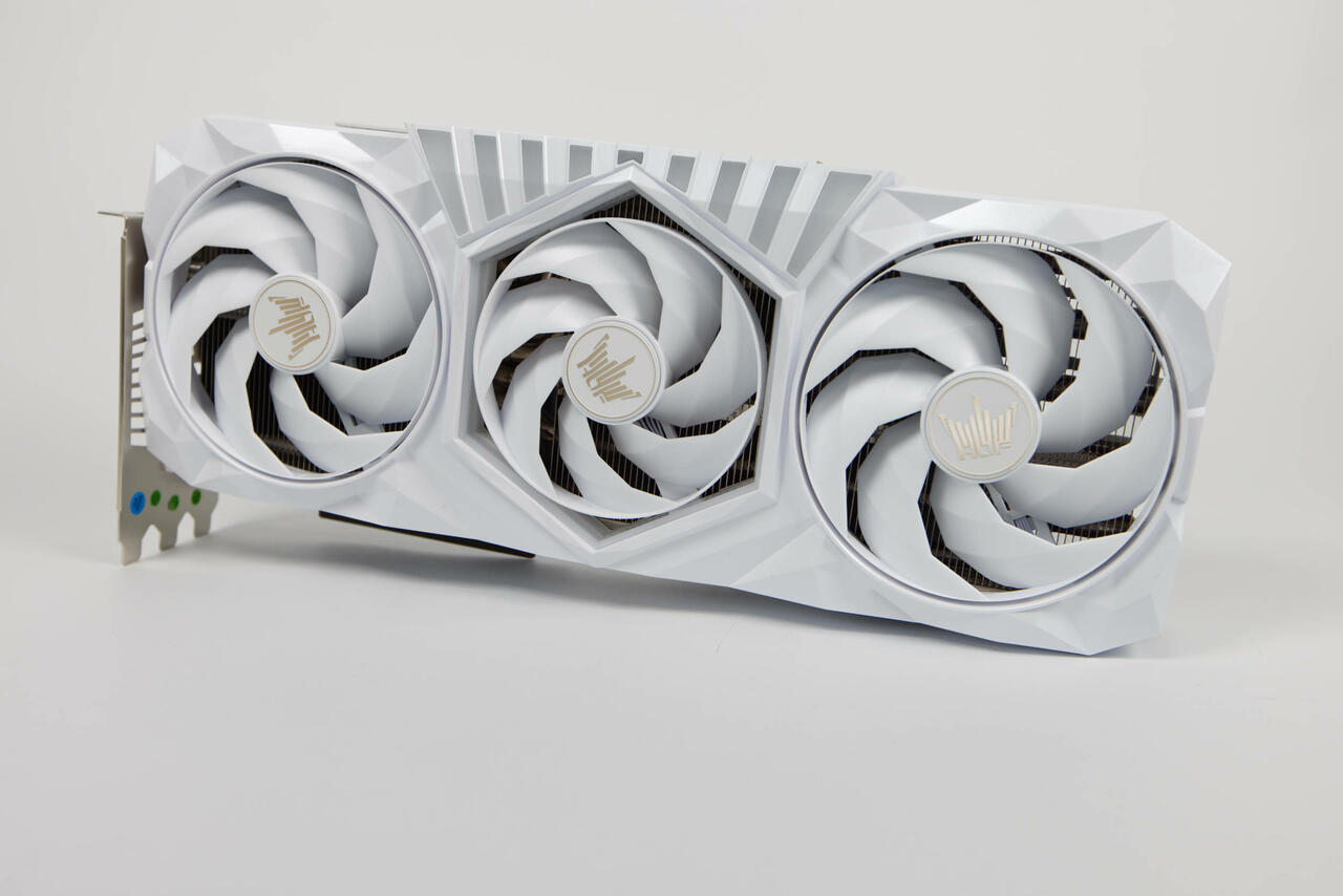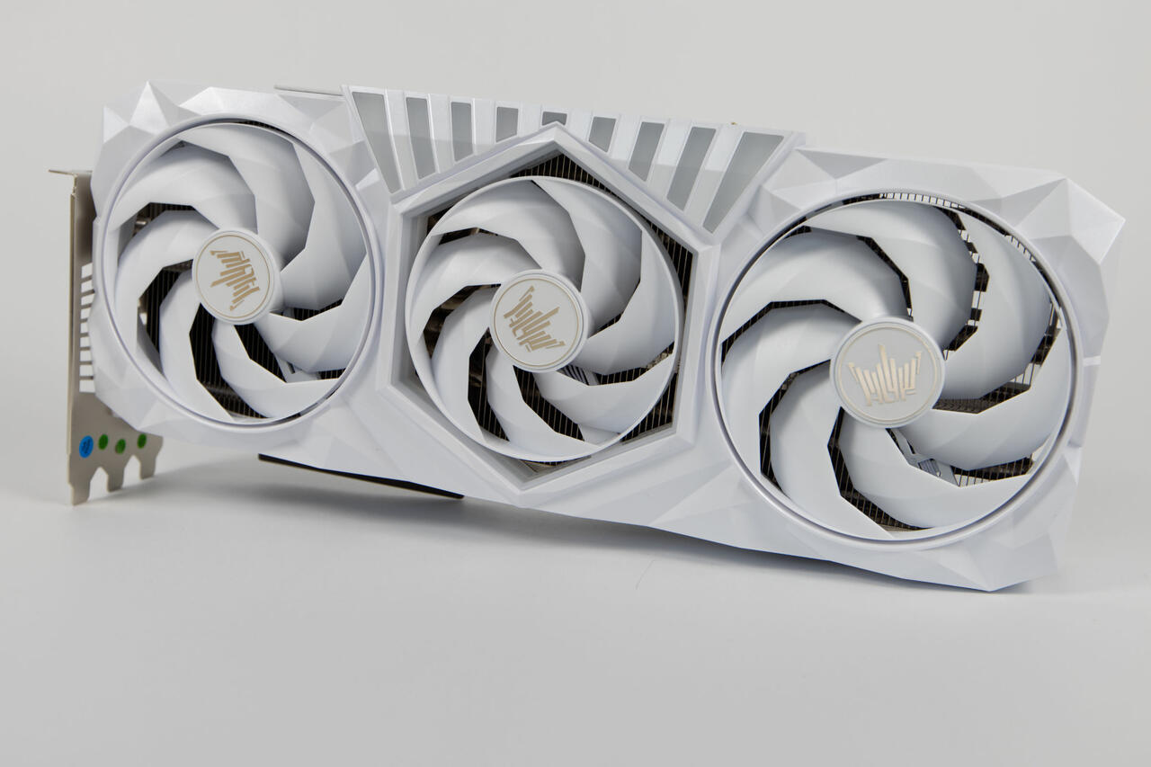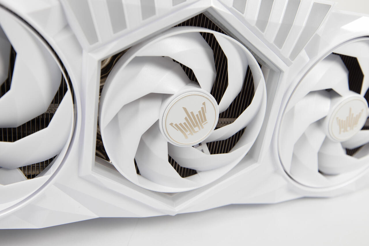 Die weiße Lackierung der Karte ist reflektierend und nicht matt. Die Verarbeitung ist auf einem sehr hohen Niceau. Die Frontabdeckung ist hier aus Plastik, wie bei den meisten Karten, weil man sie erst dann so aufwendig formen kann. Die vielen Dreiecksformen suggertieren einen kristallartigen Aufbau. Direkt in das Cover sind zwei runde und ein sechseckige Öffnung eingelassen, in der sich die drei Lüfter befinden. Die beiden äußeren haben einen 102-mm-Durchmesser und der mittlere ist mit 92 mm etwas kleiner.