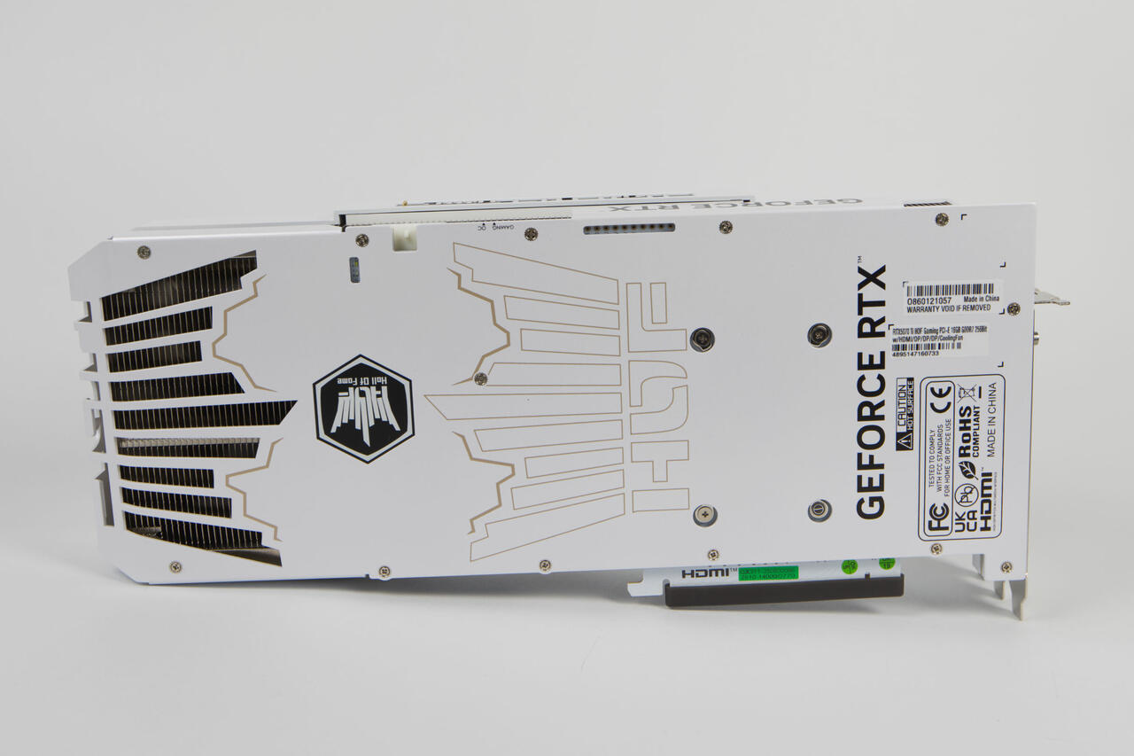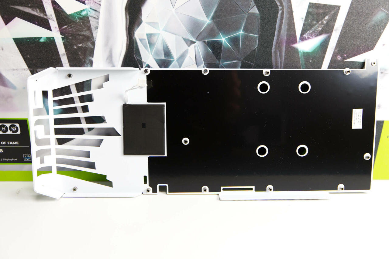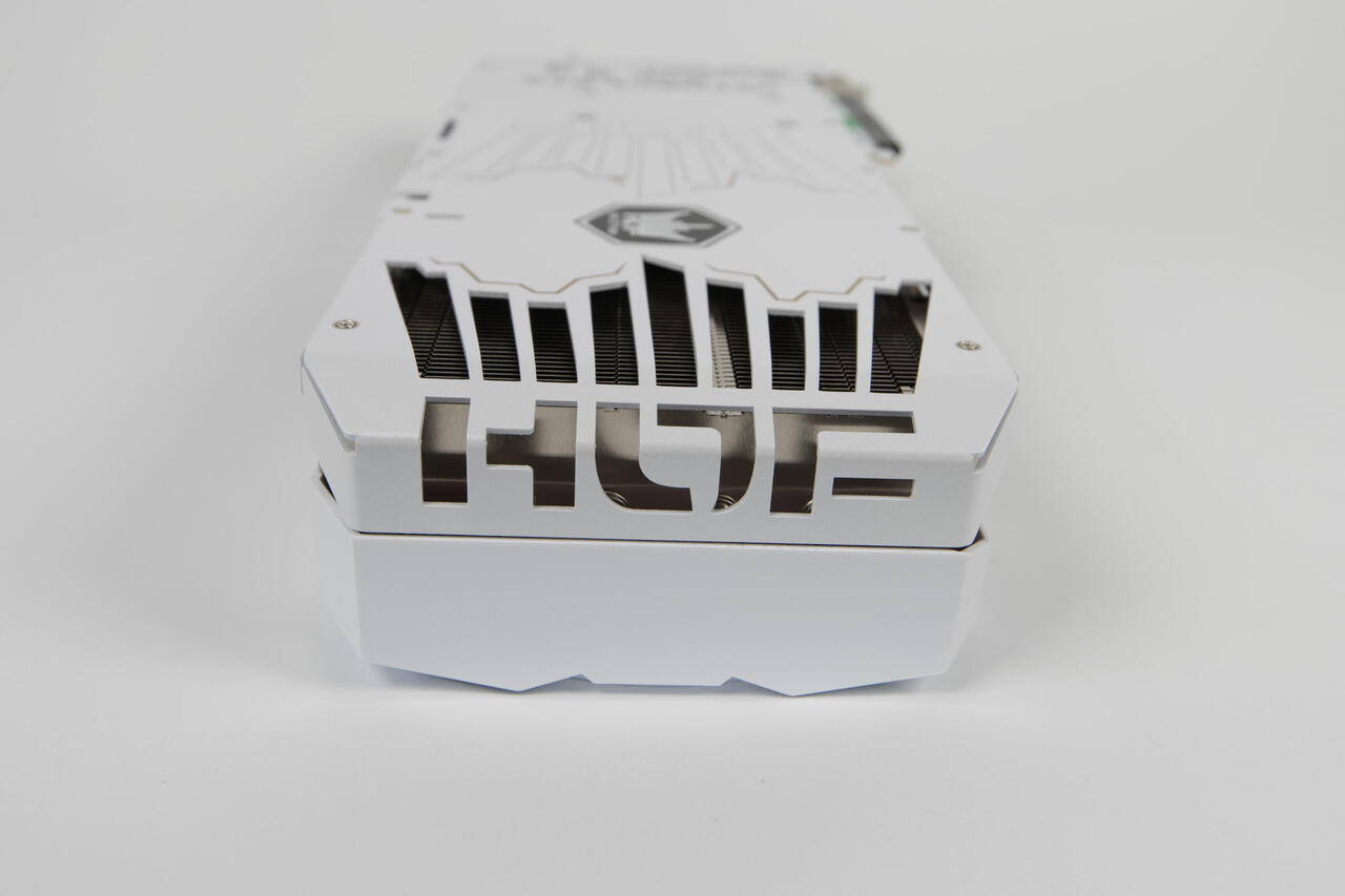 Die Rückseite wird von einer großen Backplate bedeckt, die im gleichen Stil gehalten wird. Hier kommen goldene Akzente besser hervor, die eine Krone und den HZOF-Schriftzug großflächig abbilden. Dazu gibt es eine schwarze GEFORCE RTX-Aufschrift und nochmals das HOF-Emblem, das beleuchtet ist. Besodners auffällig ist die große Aussparung am Ende der Karte, die in Form der Krone im Logo gestaltet ist. Hier kann die Luft durch, aber im Vordergrund steht wohl eher das Design. Der HOF-Schriftzug ist dabei am Ende noch ausgestanzt aus dem Rahmen. Es ist ein durchaus imposanter Anblick.