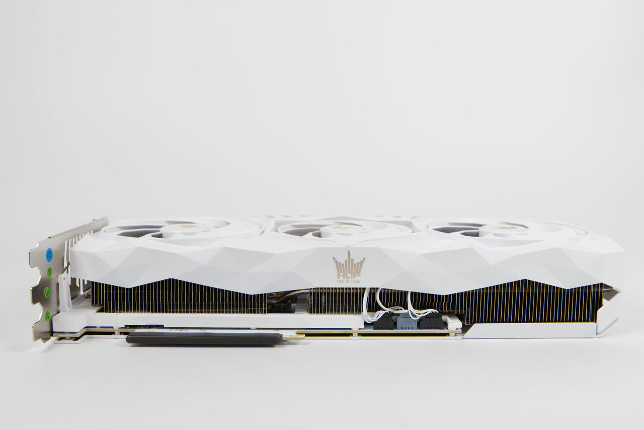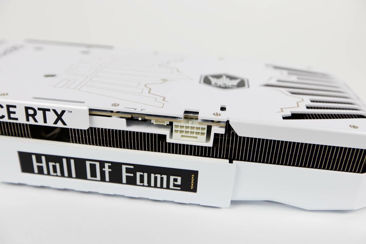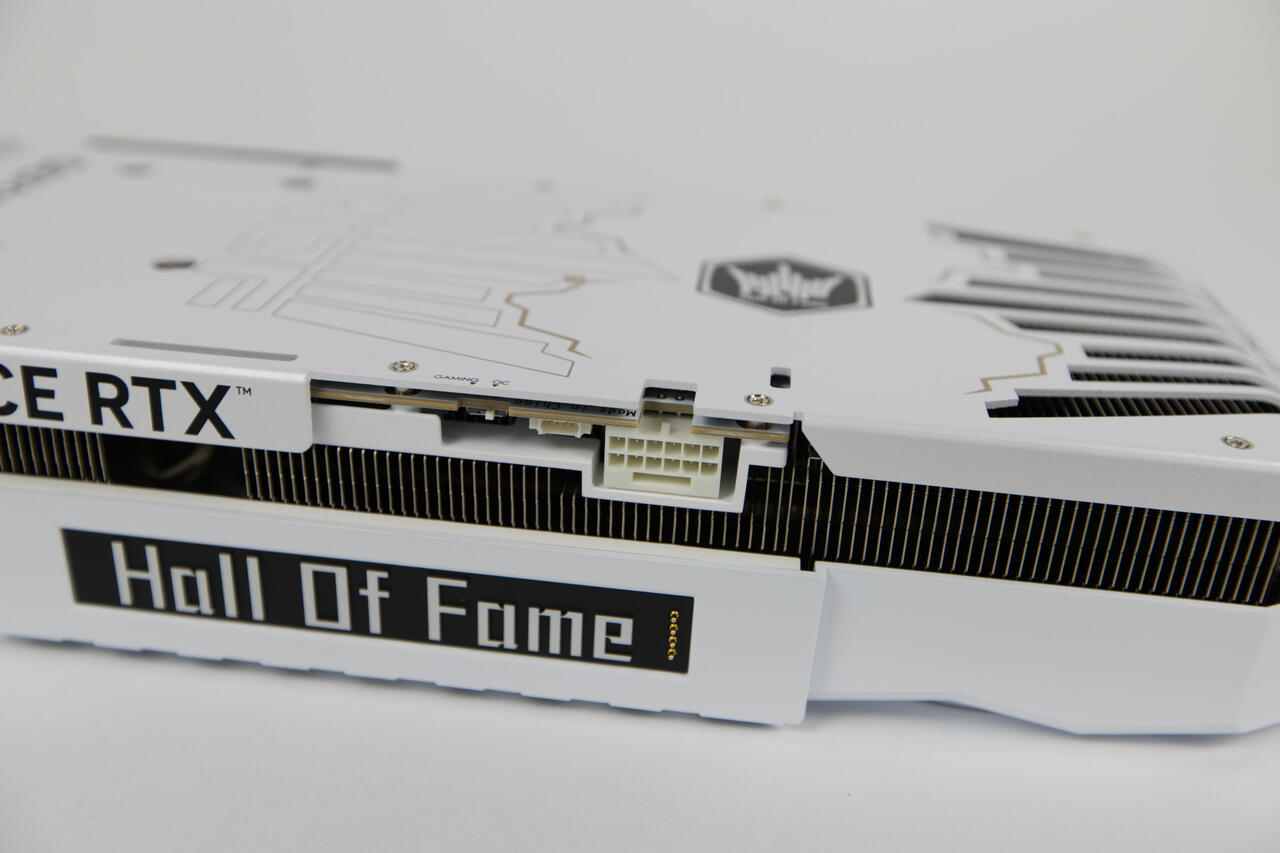 Die Rückseite wird von einer großen Backplate bedeckt, die im gleichen Stil gehalten wird. Hier kommen goldene Akzente besser hervor, die eine Krone und den HZOF-Schriftzug großflächig abbilden. Dazu gibt es eine schwarze GEFORCE RTX-Aufschrift und nochmals das HOF-Emblem, das beleuchtet ist. Besodners auffällig ist die große Aussparung am Ende der Karte, die in Form der Krone im Logo gestaltet ist. Hier kann die Luft durch, aber im Vordergrund steht wohl eher das Design. Der HOF-Schriftzug ist dabei am Ende noch ausgestanzt aus dem Rahmen. Es ist ein durchaus imposanter Anblick.
