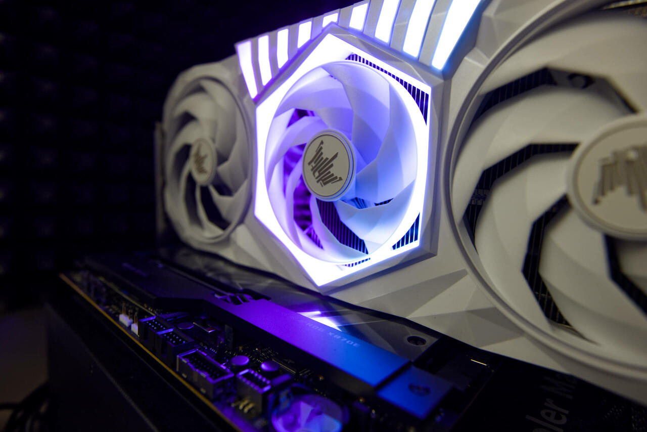 Beim Startvorgang hat die Beleuchtung eine weitere Funktion, denn sie schimmert nicht in allen Farben, sondern weist auf mögliche Fehler hin. Leuchtet die Karte gelb, so steckt die Karte nicht richtig im PCIe-5.0-Slot fest. Rote Farbe weist einen darauf hin, dass die Stromversorgung über den PCIe-Slot nicht normal abläuft. Diesen Hinweis haben wir mehrfach gehabt beim booten und er verschwindet meist nach kurzer Zeit, sobald der Bootvorgang weit genug vorangeschritten ist.