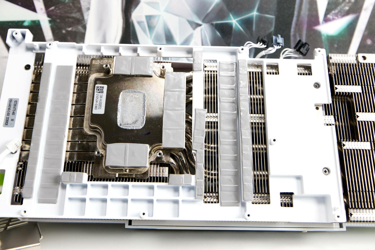In der Mitte gibt es dann noch eine große Vapor-Chamber, die die Wärmeübertragung von GPU und RAM auf den Kühlblock darunter effizient verteilt. Für die GDDR7-VRAM-Chips gibt es passende Wärmeleitpads und der Kontakt zur Blackwell-GPU wird über sehr zähe Wärmeleitpaste hergestellt.