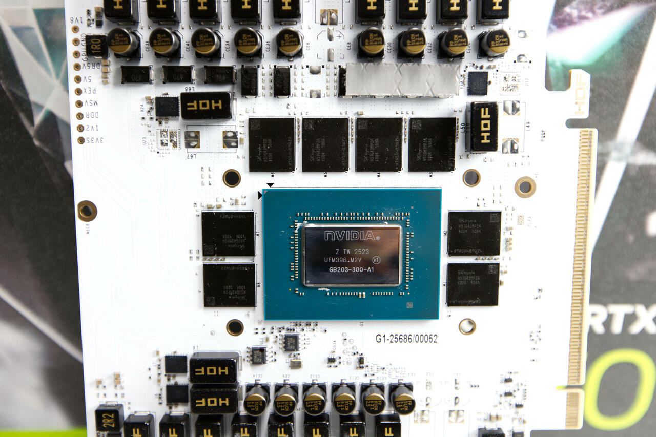 KFA2 verbaut auf seiner GeForce RTX 5070 Ti HOF Gaming White Edition insgesamt acht Chips mit 2 GB-Kapazität. Die Chips werden von Skhynix gefertigt und haben die Kennung H57G42MP2A X004 508A. Zu dem Chip konnten wir jedoch keine Datenblätter finden, weshalb man nicht zu viel dazu sagen kann. Auf der Webseite von KFA2 wird die Speicherbandbreite mit 960 GB/s angegeben. Der Speicherbus bietet wie spezifiziert 265 bit Breite.Demnach müssten die Speicherchips mit 30 GB/s arbeiten.