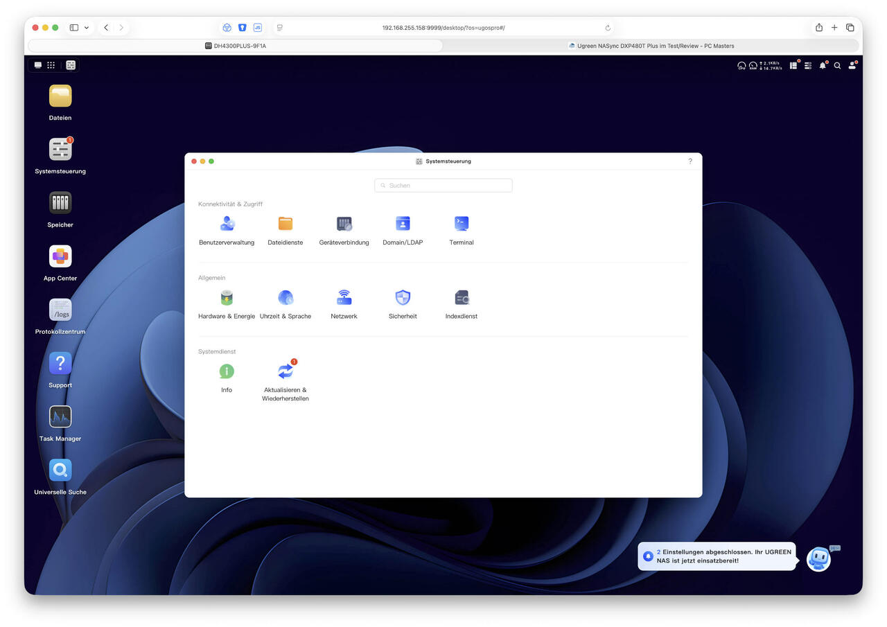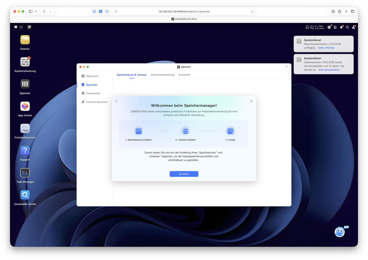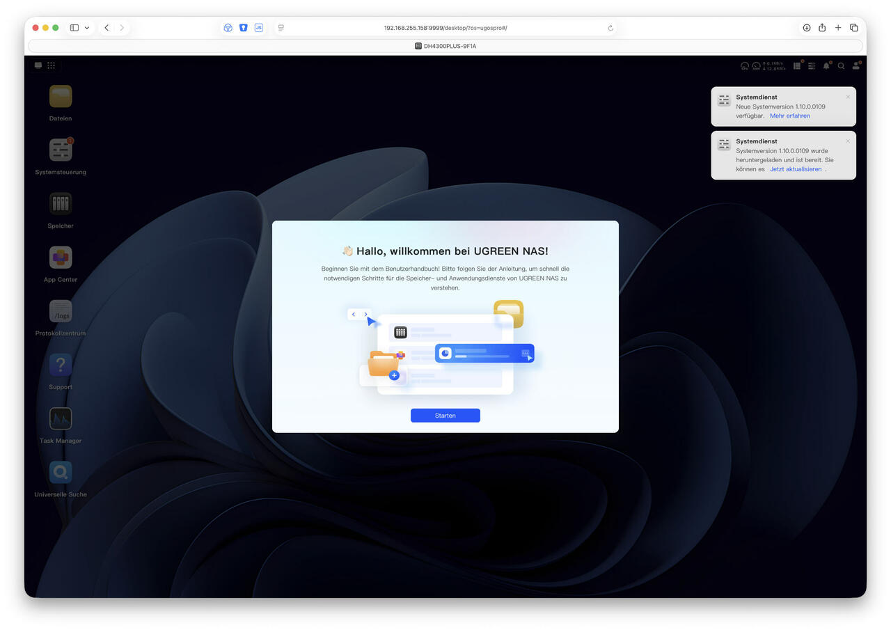 Das NASync DH4300 Plus setzt, wie auch schon alle anderen UGREEN-NAS-Systeme davor, auf UGOS PRO, das firmeneigene Betriebssystem von UGREEN. Schon beim ersten Start wird schnell klar, dass UGREEN in den letzten Monaten etwas Feinschliff betrieben hat.