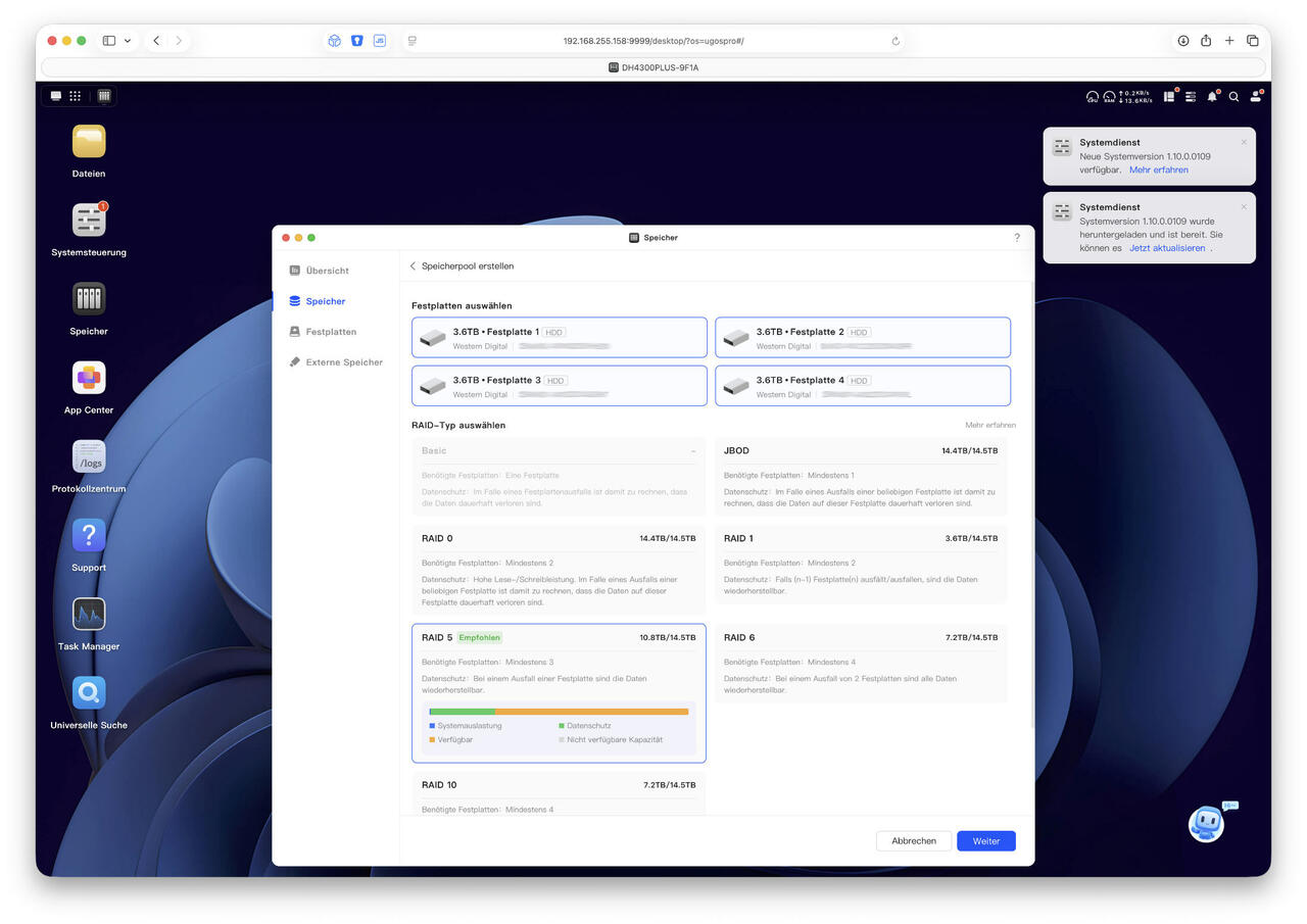 Nach dem ersten Login steht die Wahl des RAID-Verbunds an. Je nach verbauten Laufwerken schlägt das System sinnvolle Optionen bereits vor. Für unseren Test entscheiden wir uns für ein klassisches RAID 5, da hier sowohl Ausfallsicherheit als auch Speicherkapazität gut zusammenpassen und wir sowieso vier Festplatten verbaut haben. Das Erstellen des Verbunds erfolgt im Hintergrund und dauerte bei uns einige Stunden, während man parallel aber schon Benutzerkonten oder erste Freigaben vorbereiten kann.