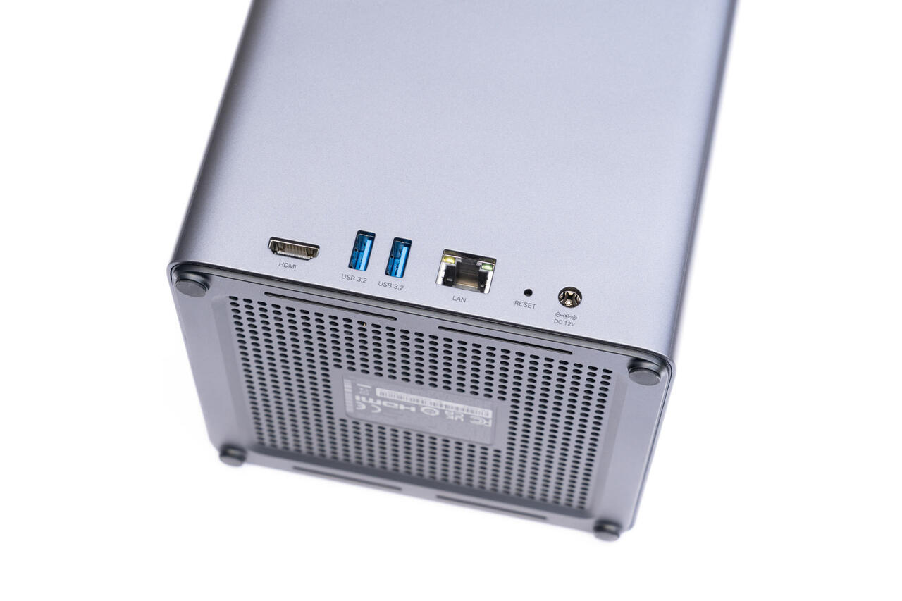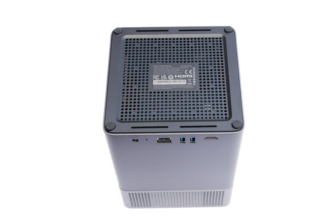 Haptisch fühlt sich das Gerät hochwertig an. Das Aluminiumgehäuse ist kühl, griffig und vermittelt sofort das Gefühl, ein stabiles Gerät in Händen zu halten. Auch das Gewicht von knapp über 1,6 kg gibt dem DH4300 Plus eine gute Standfestigkeit. Das NAS steht dabei sicher auf vier gummierten Füßen, die kleine Vibrationen dämpfen und verhindern, dass das Gerät auf glatten Oberflächen rutscht.
