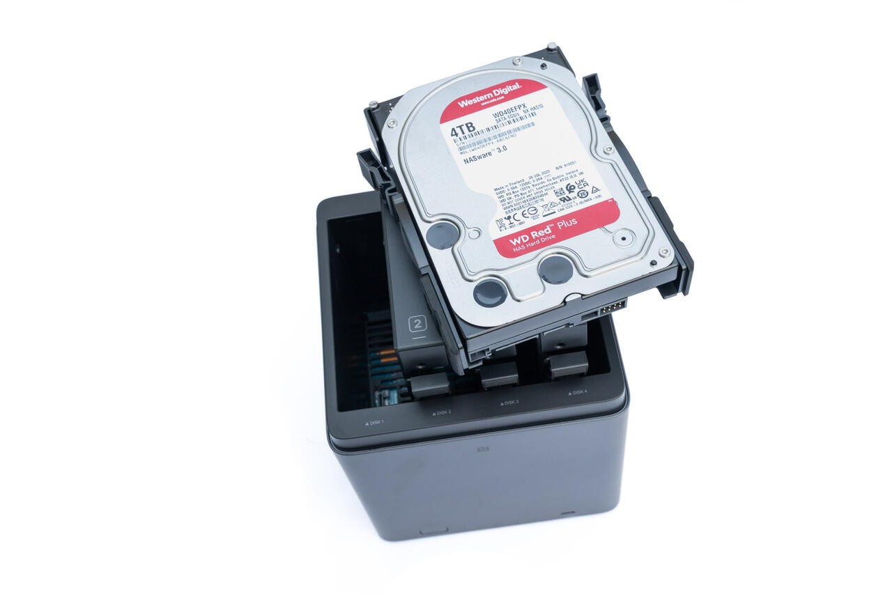 Bevor das UGREEN NASync DH4300 Plus zum ersten Mal ans Netz geht, steht natürlich der Einbau der Festplatten an. Das geht beim DH4300 Plus erstaunlich stressfrei. Im Test kommen bei uns Western Digital Red Plus mit 4 TB zum Einsatz. Wir heben einfach die Deckelklappe ab, ziehen die Trays heraus und setzen die Laufwerke ein. Die Einschübe wirken solide und haben genügend Spiel, damit beim Einsetzen nichts hakt. Die Gleitbahnen sind aus Gummi und scheinen von Beginn an für eine leichte Entkoppelung zu sorgen. Im Gegensatz zu anderen UGREEN-NAS-Systemen benötigen wir hier aber sowohl für 3,5-Zoll- als auch für 2,5-Zoll-HDDs die beiliegenden Schrauben, was aber kein Problem darstellen sollte. Sobald alle Platten an Ort und Stelle sitzen, geht’s auch schon weiter.