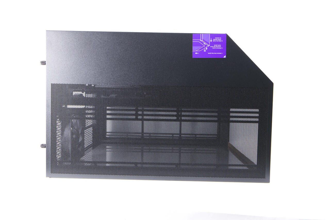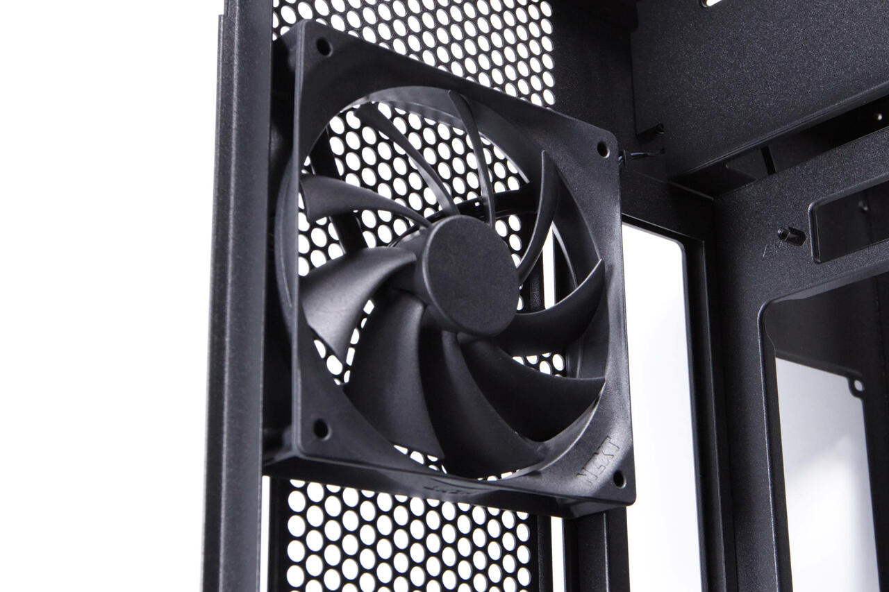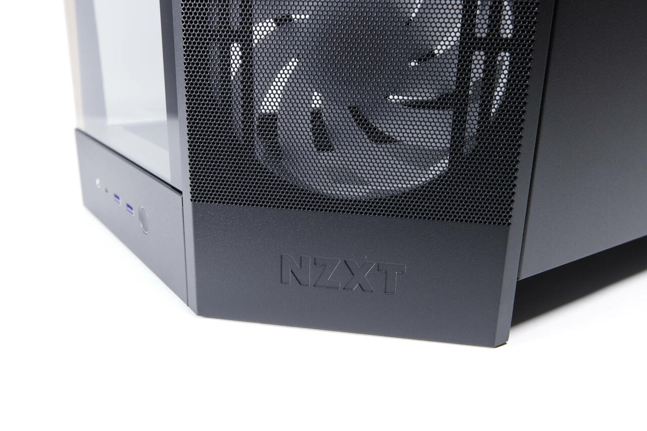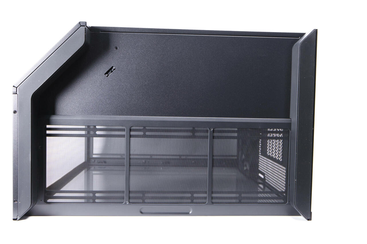 Der Airflow-Fokus wird schnell ersichtlich, denn trotz der beiden Hartglas-Panels, finden wir an der abgewinkelten Seite, aber auch unten und oben große Mesh-Panels. Diese sind hervorragend für Luftdurchfluss geeignet und sollen die Fishtank-Problematik mitigieren. Die abgewinkelte Form soll auch dazu dienen, den Luftfluss ab Werk so zu steuern, dass die Luft seitlich eingezogen und dann nach hinten hin gepresst wird, wo der kleine Lüfter noch einmal etwas unterstützt.