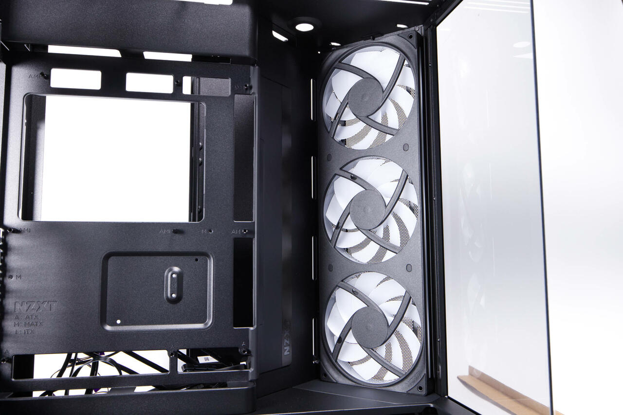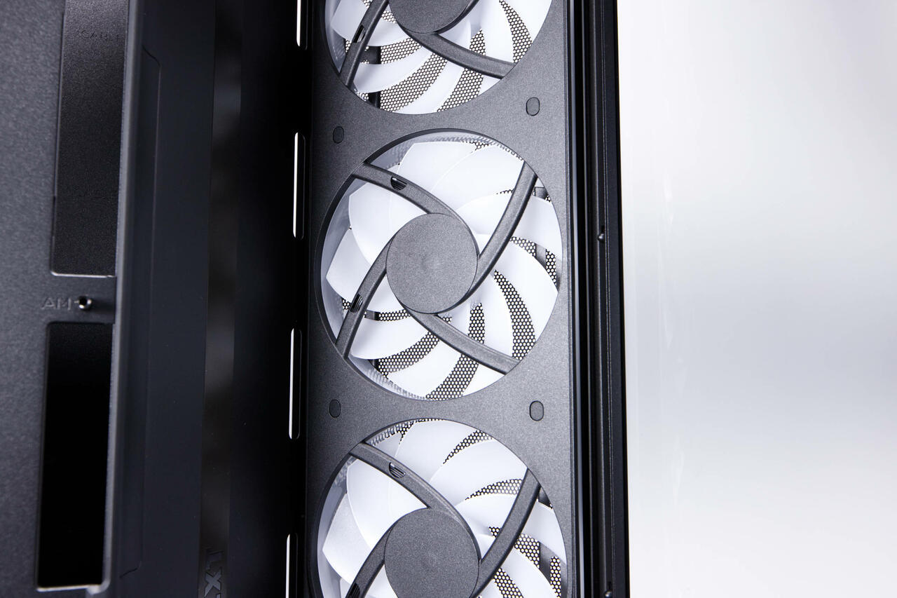 Diese beherbergt drei große 140er-Lüfter, die als F420 RGB Core im Single-Frame-Design vereint sind. Durch diesen abgewinkelten Bereich kommt auch das Dual-Chamber-Design erst zur Geltung, denn die Rückseite bietet im Inneren wirklich viel Platz.