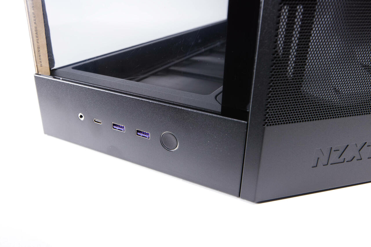 Die Anschlüsse und Buttons befinden sich bei dem H9 Flow RGB an der Front, aber unten. Die Position ist Geschmackssache, wir finden sie aber gut. Neben dem großen Power-Button, finden wir hier links davon zwei USB 3.2 Type-A mit Lila-Innenfarbe, daneben noch einen modernen USB 3.2 Gen2x2 Type-C-Port sowie einen Headset 3,5 mm Jack.
