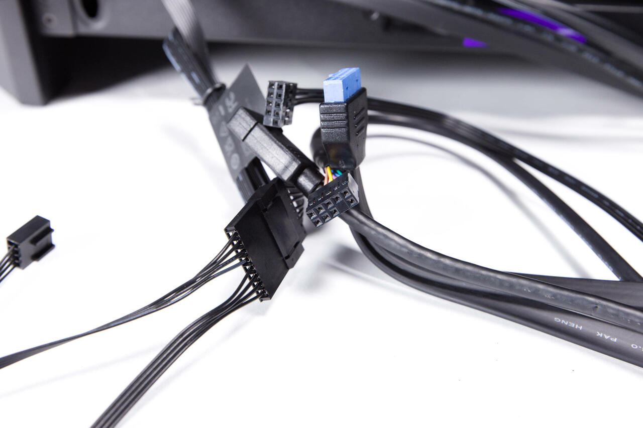 Daraufhin haben wir direkt den ATX- und CPU-EPS-Stecker vom Netzteil ans Board geklemmt und die Kabel dafür verlegt. Auch die Kabel für das IO-Panel inkl. USB-Steckern und Buttons haben wir dabei schon angeschlossen.