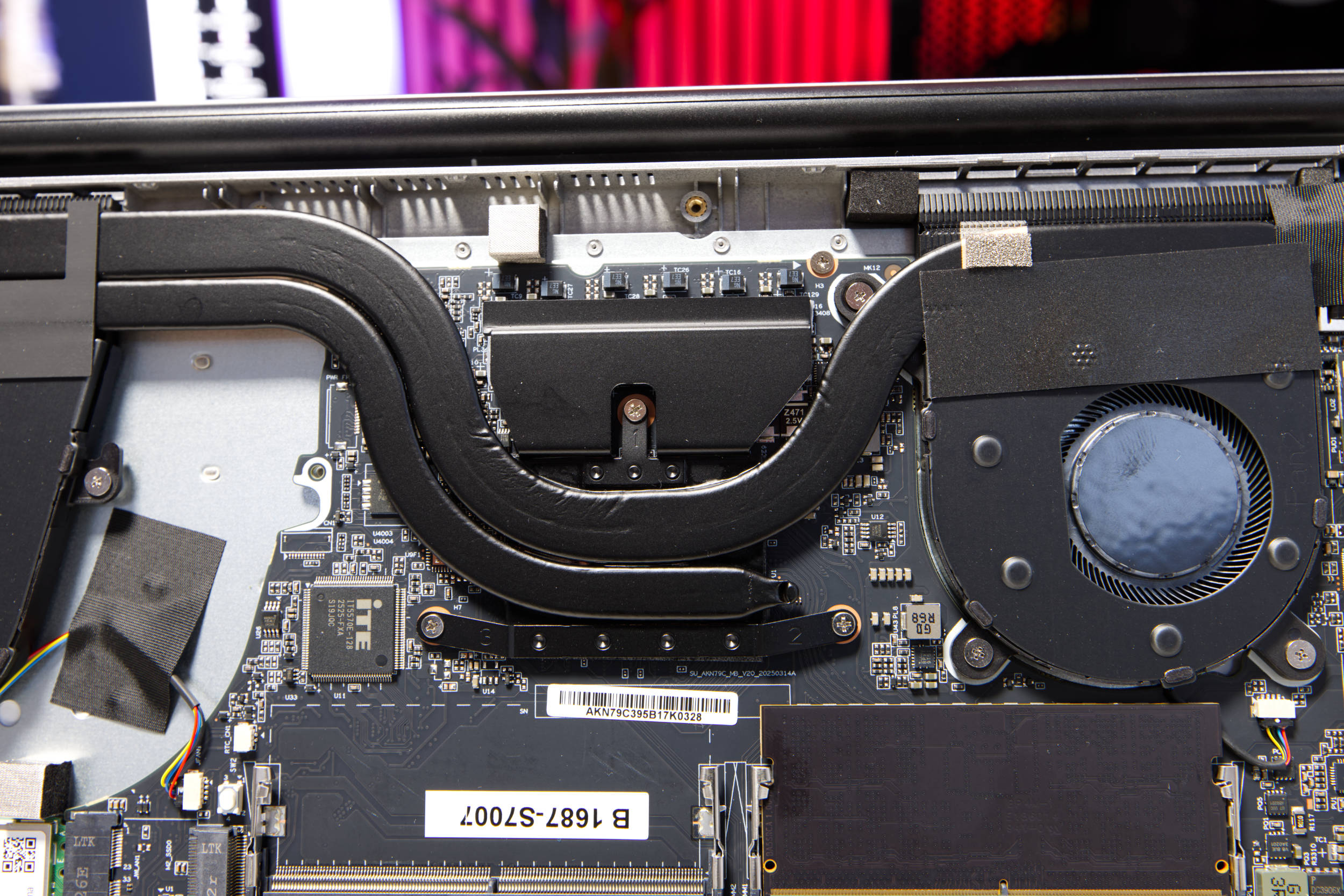 Bei der Kühlungssystem finden wir keine großen Überraschungen. Mittels zwei Heatpipes wird die Abwärme von CPU und iGPU nach außen zu den beiden Kühlern geführt. Die dickere Heatpipe verbindet beide Kühlsegmente und die dünnere nur den linken Kühler.