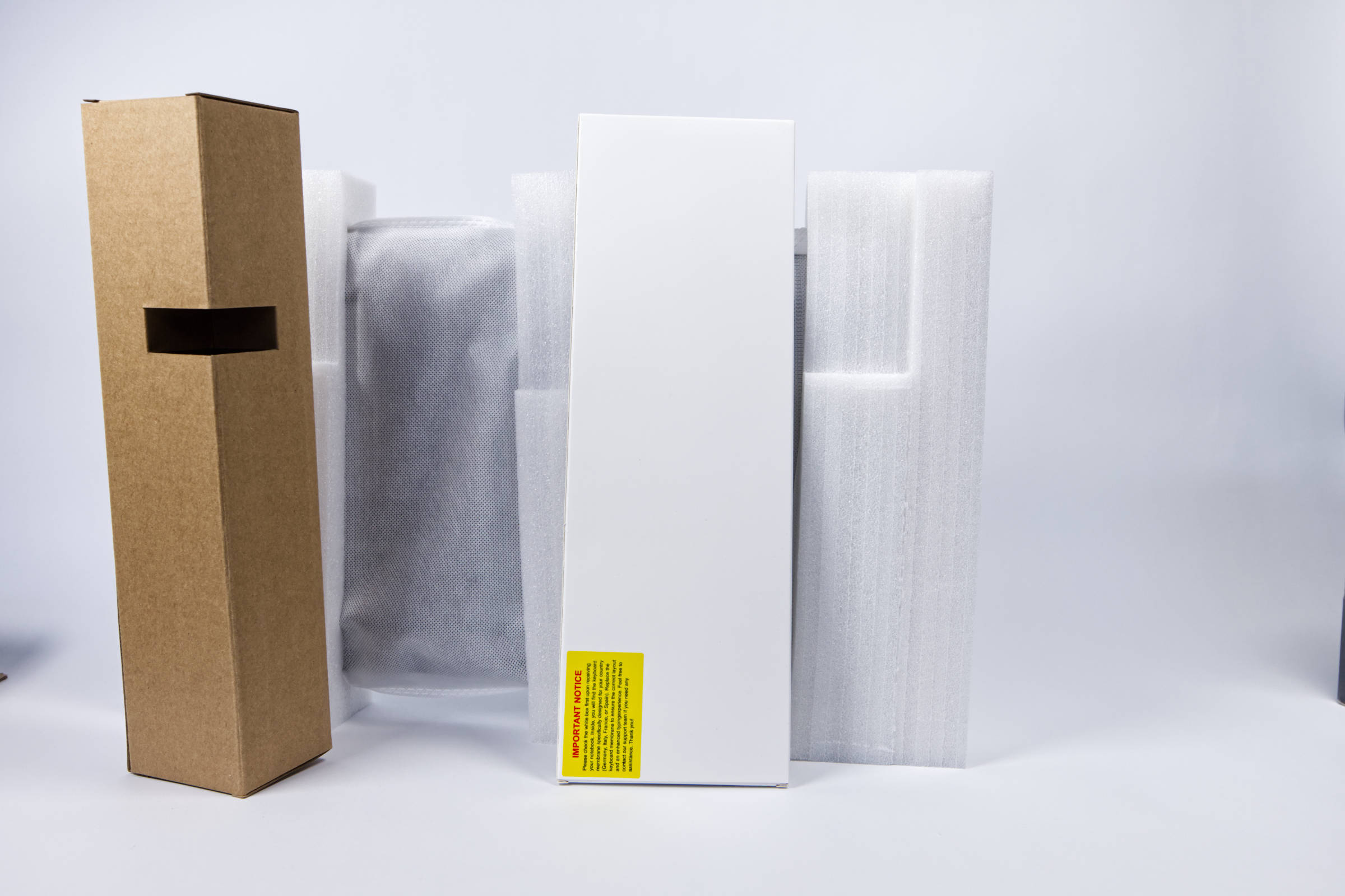 Das Notebook ist zentriert in der Mitte dirch Styropor fixiert und damit sicher beim Transport. Es ist außerdem in einer dicken Plastikhülle, die noch weiteren Schutz bieten soll.