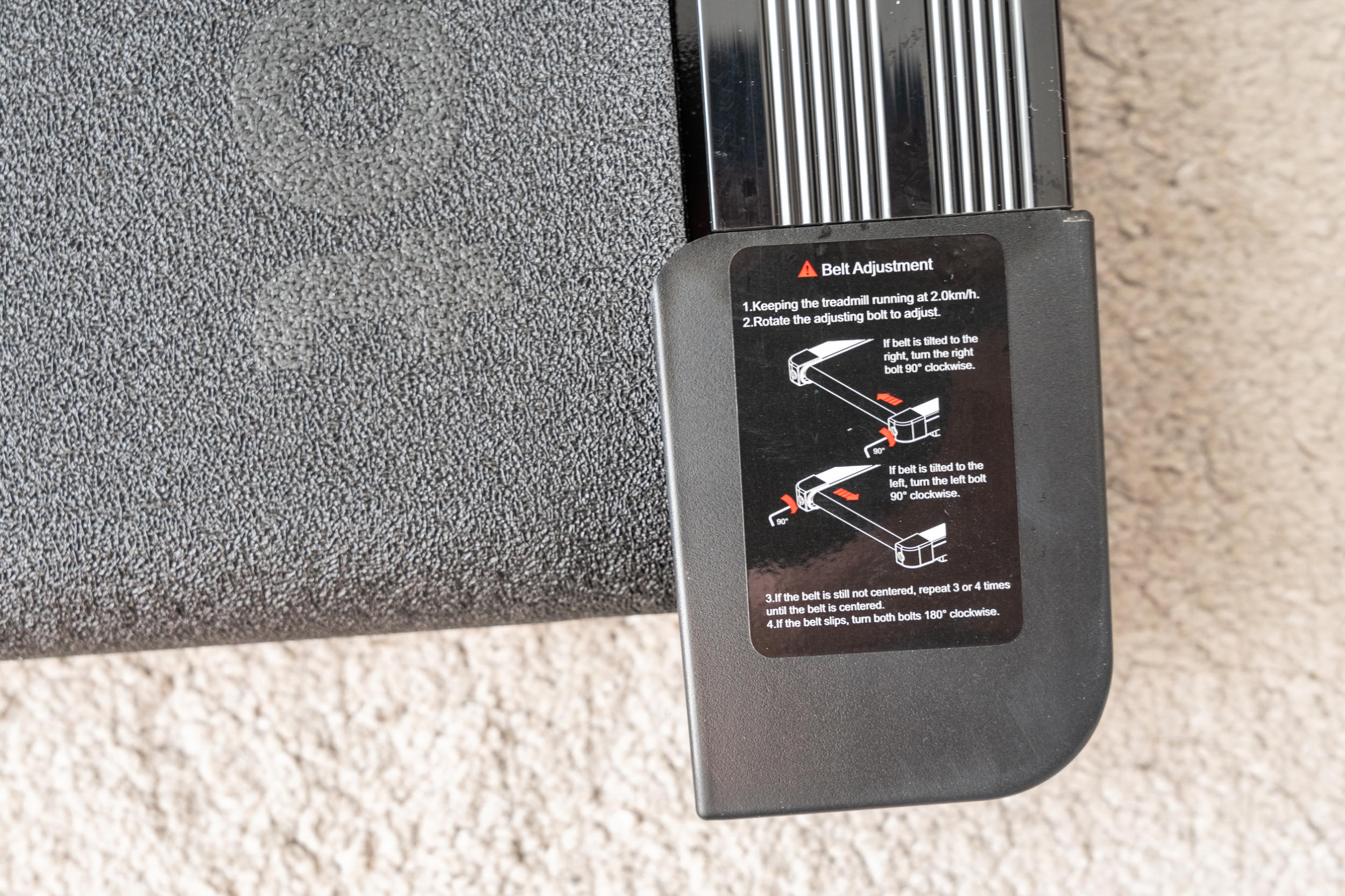 Mit dem beiliegenden Inbusschlüssel kann das Band bei Bedarf nachjustiert werden und eine gut verständliche Bedienungsanleitung erklärt uns die wichtigsten Schritte. Nicht zu vergessen ist das abnehmbare Stromkabel, das mit einer Länge von 180 cm für viele Arbeitsplätze wohl reicht. Das sonst beiliegende Fläschchen mit Schmiermittel für das Laufband fehlt bei unserem Testmuster. Laut diversen Berichten gibt es das wohl immer direkt vom Hersteller mit dazu, bei unserer Lieferung wurde das aber vergessen.