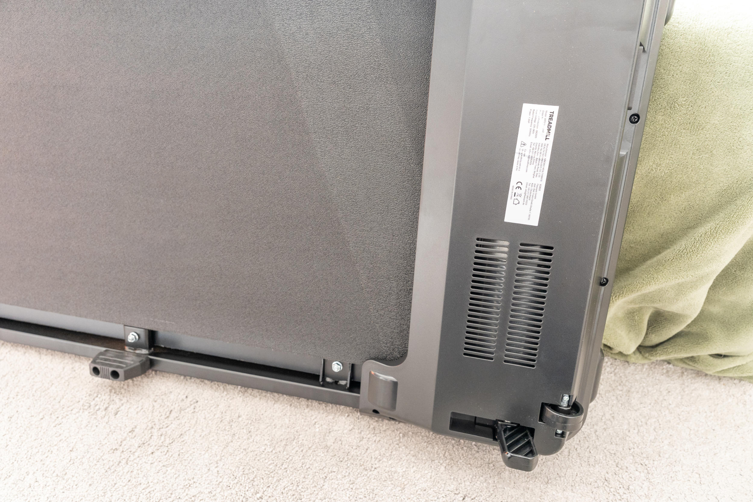 Das Stromkabel besitzt eine Länge von 180 cm, was für viele durchaus ausreichend ist. Für die meisten Setups passt das, bei etwas freierer Platzierung kann aber eine Verlängerung nötig werden. Das Stromkabel ist abnehmbar, was den Umgang etwas flexibler gestaltet. Ein üblicher Kaltgerätestecker kommt hier zum Einsatz. Über zwei ausklappbare Stützen lässt sich das MotionX vorne zusätzlich leicht anheben und damit etwa 7% nach oben neigen. Das erhöht die Anstrengung etwas, macht das Laufband in dieser Position aber schlechter verschiebbar, da die Rollen wegen der Erhöhung schlechter greifen.