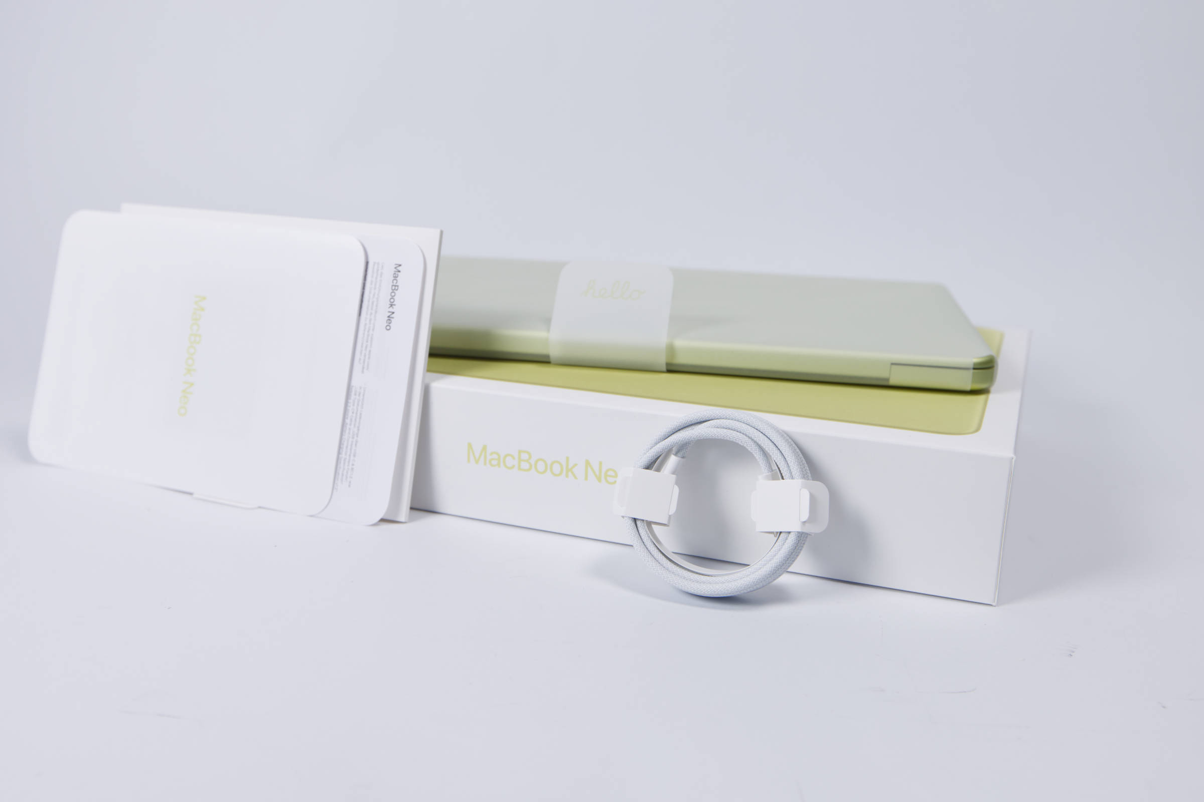 Das MacBook Neo ist in eine dünne Papierschicht eingewickelt, wie man es auch von allen anderen Macs kennt. Auf der Lasche steht „hello“, was eine Neuerung ist.