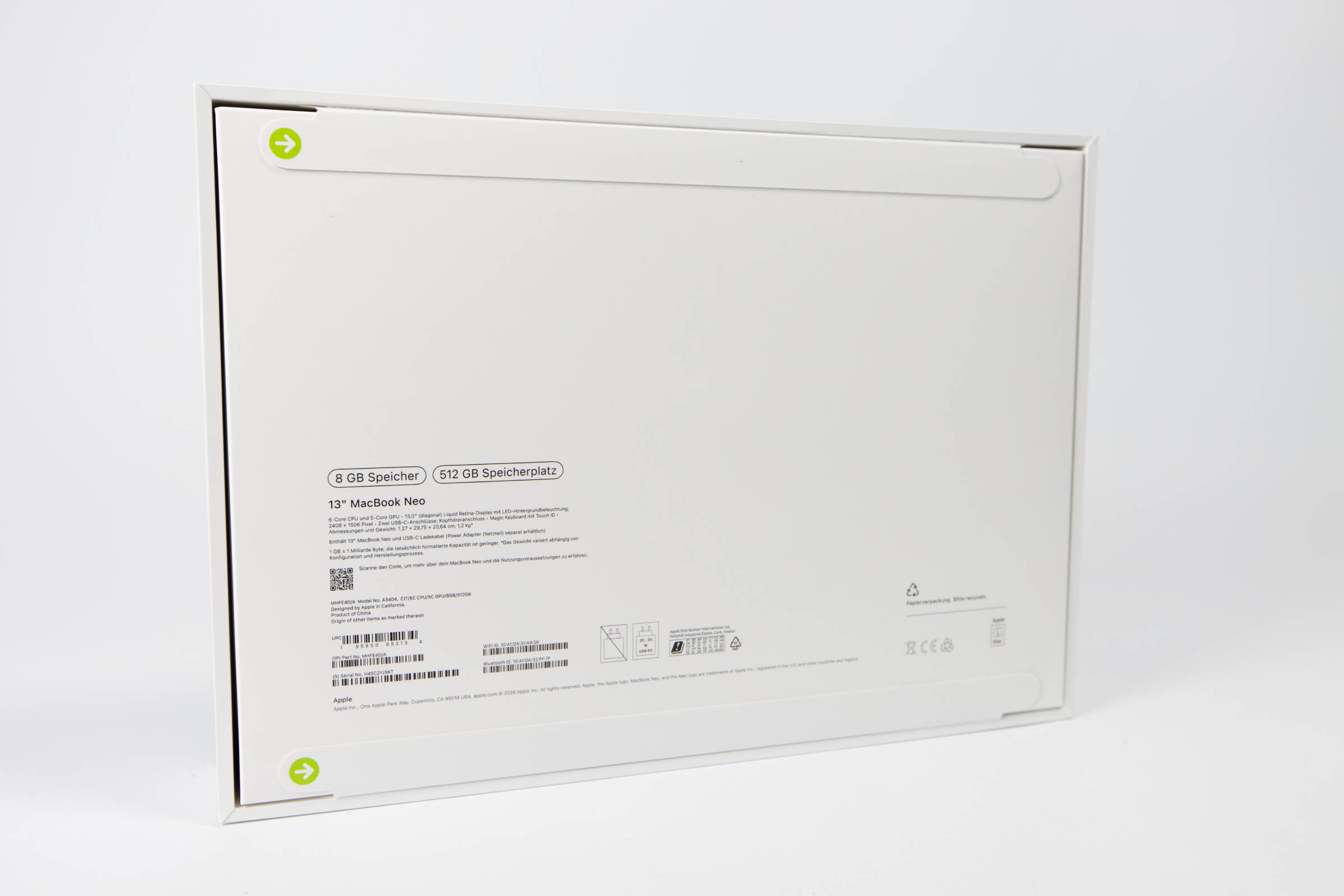 Die weiße Umverpackung des MacBook Neo ist nochmals dicker und schwerer. Die Front wird von einem fast 1:1-Bild des Notebooks geprägt. Auf der Rückseite muss man zwei Laschen ziehen, um die Verpackung zu öffnen. Danach kann man den großen Deckel abziehen.