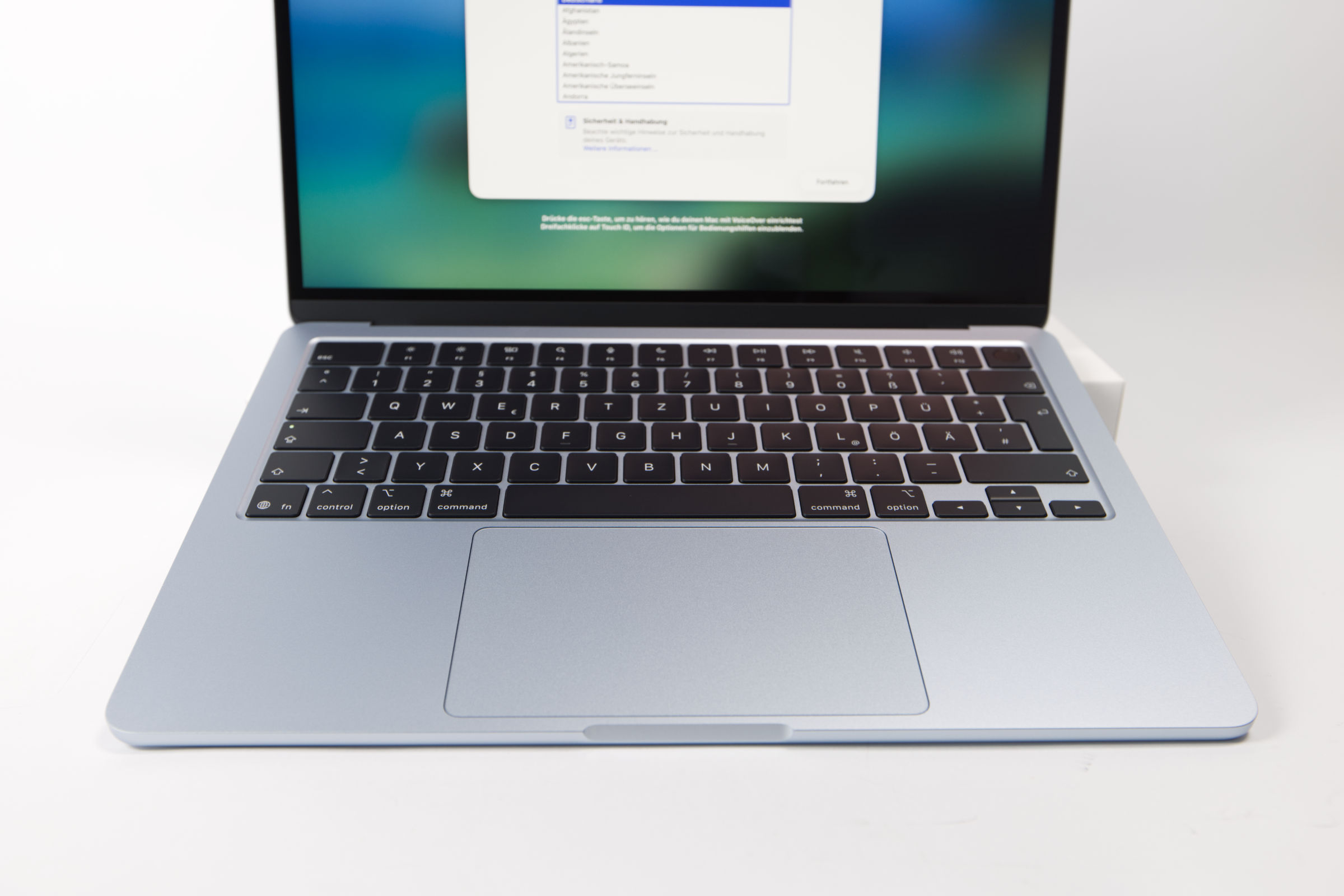 Die Tastatur ist natürlich im gewohnten DE-Layout für die deutschsprachigen Käufer. Die Low-Profile-Tasten sind im gewohnten Schwarzton gehalten und bieten eine Hintergrundbeleuchtung. Sie fühlen sich beim Tippen sehr angenehm an, wie man es auch sonst vom MacBook Air kennt.