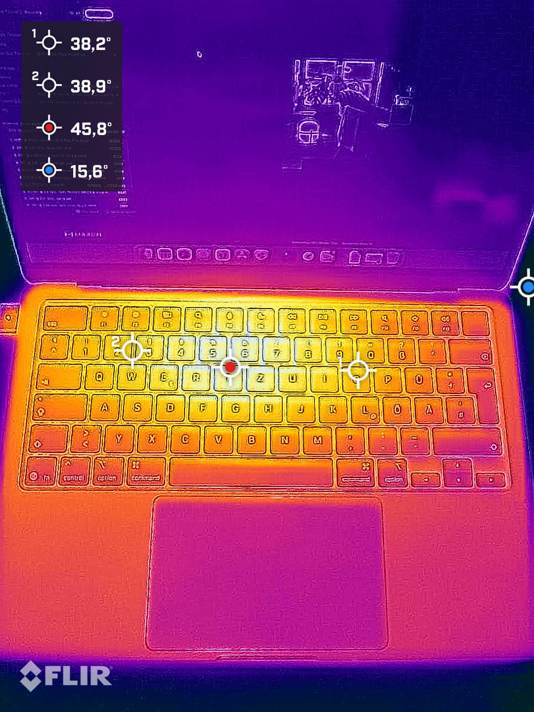 Wärmebildaufnahmen zeigen, dass sich die Wärme hauptsächlich im Bereich des Motherboards konzentriert. Trotz dieser lokalen Erwärmung bleibt die thermische Gesamtleistung akzeptabel. Das Aluminiumgehäuse erhitzt sich auf eine relativ kühle Temperatur von etwa 38 °C und dem Hotspot von ca. 46 °C.