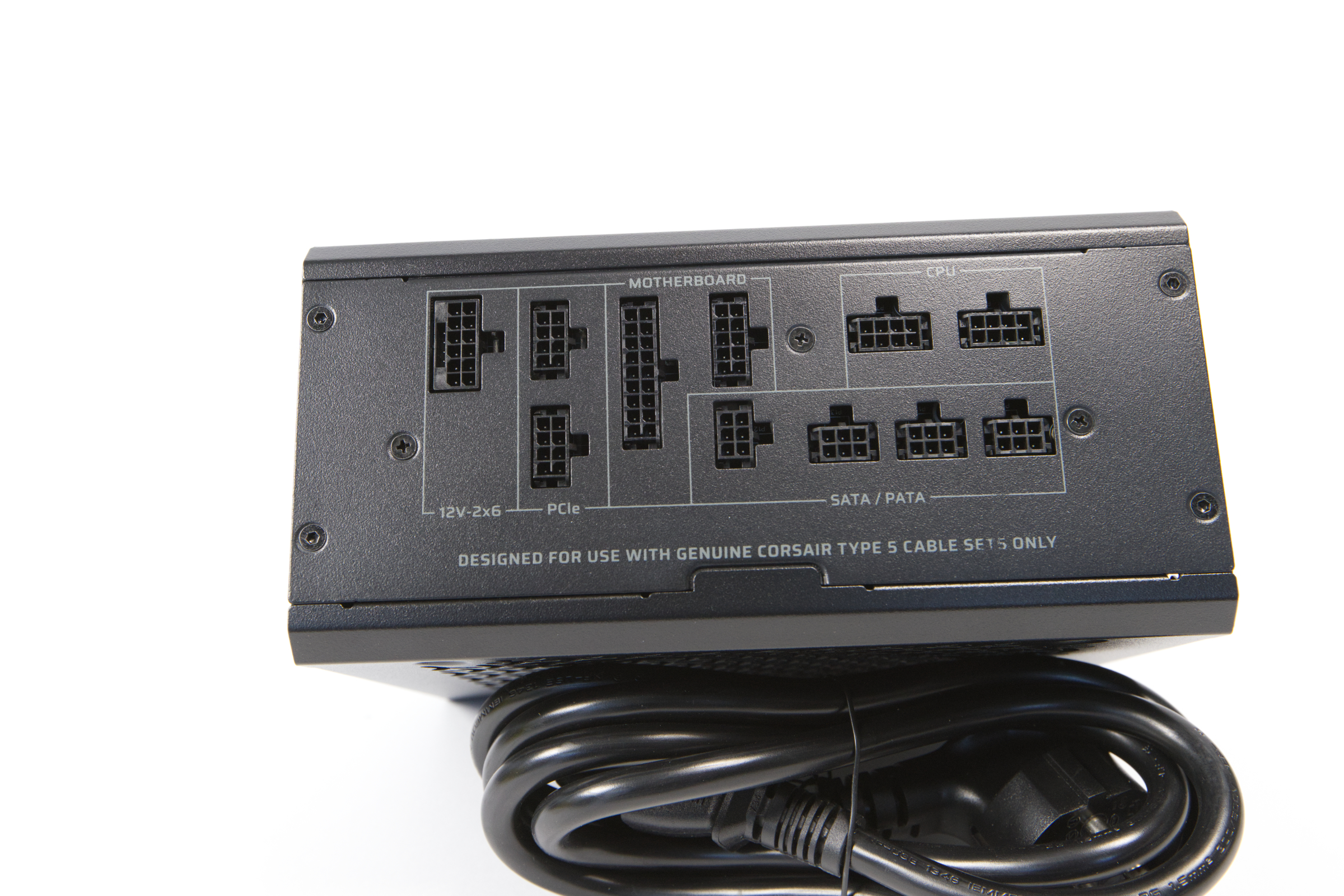 Statt auf gewöhnlich große Stecker zu setzen, wählt Corsair deutlich kleinere Type 5-Anschlüsse. Diese sind teils schwerer einzustecken, aber haben den Vorteil, dass sie kompakter sind und auch weniger abstehen. Corsair sagt, dass im Gehäuse mindestens 30 mm Abstand zum Seitenteil vorhanden sein muss, um die Kabel zu biegen.