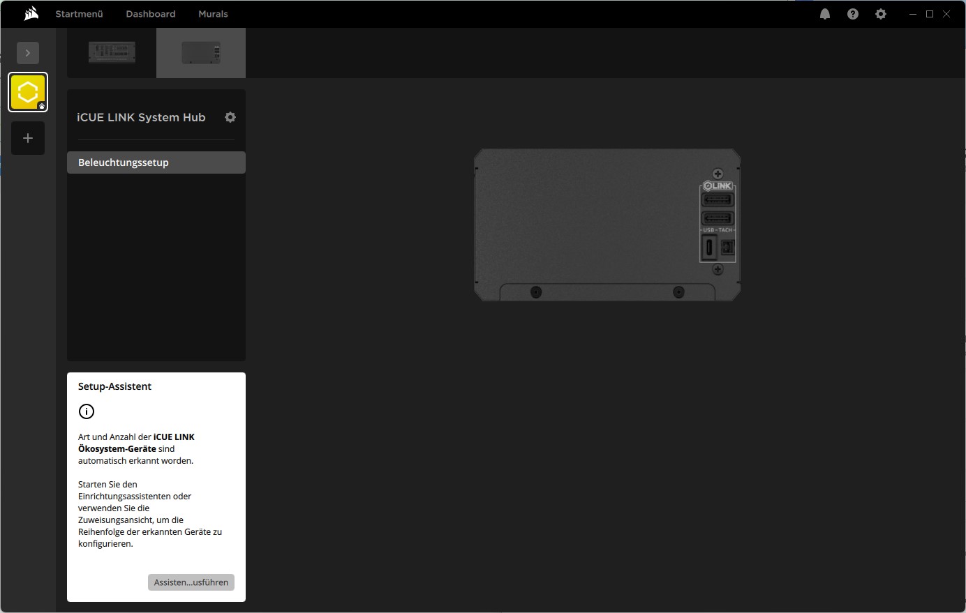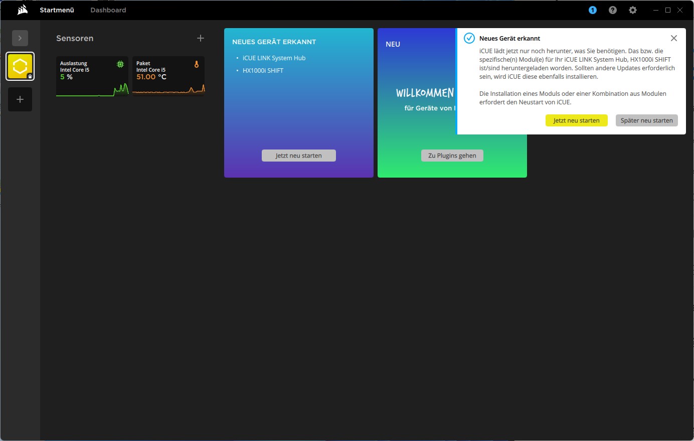 Nach der Installation der iCUE-Software, wird der Controller erkannt und die Software muss erst neugestartet werden, um die Integration zu vollenden.
