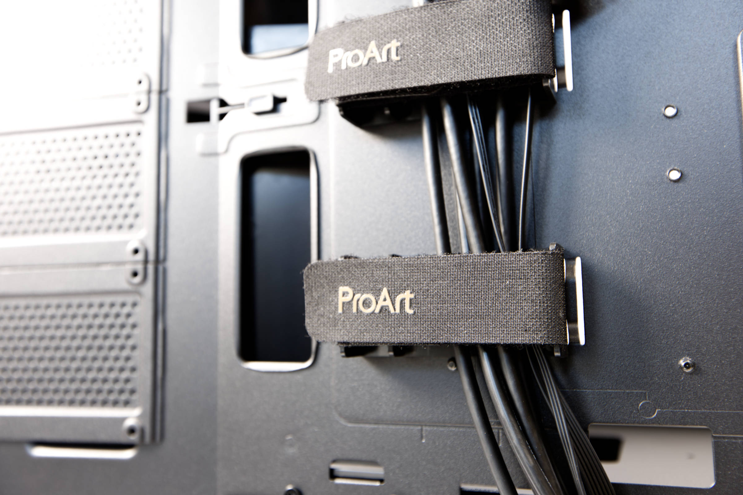 Beim Kabelmanagement gibt es viele Optionen. Die bereits verlegten Kabel sind gut positioniert und so legt man noch weitere dazu. In der Mitte sind dafür sehr dicke, mit ProArt-gebrandete Klettverschlüsse vormontiert. Sie bieten guten Halt für dicke Kabel und sind als Backbone geeignet.