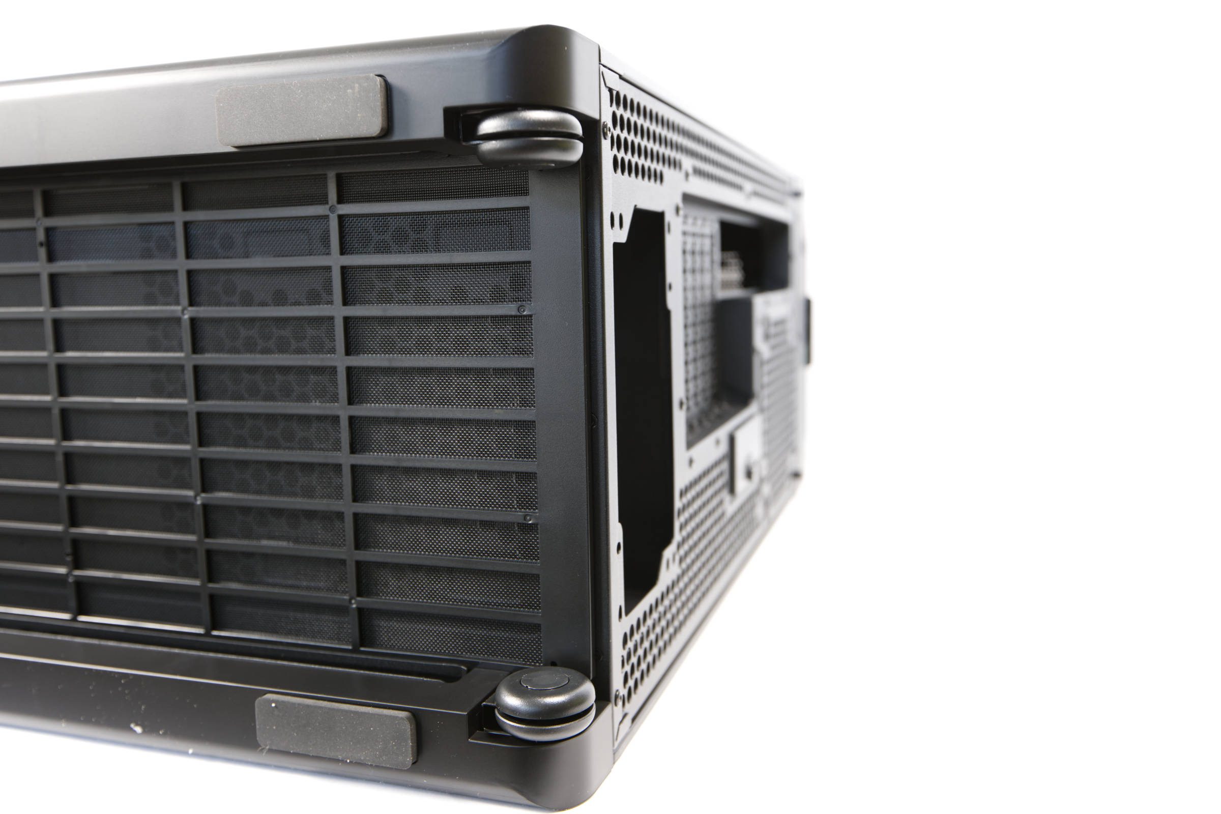 Unten ist noch ein großer Staubfilter befestigt, den man auch leicht lösen kann. Das Gehäuse steht auf langen Gummi-Pads, die auch Vibrationen dämmen sollen.