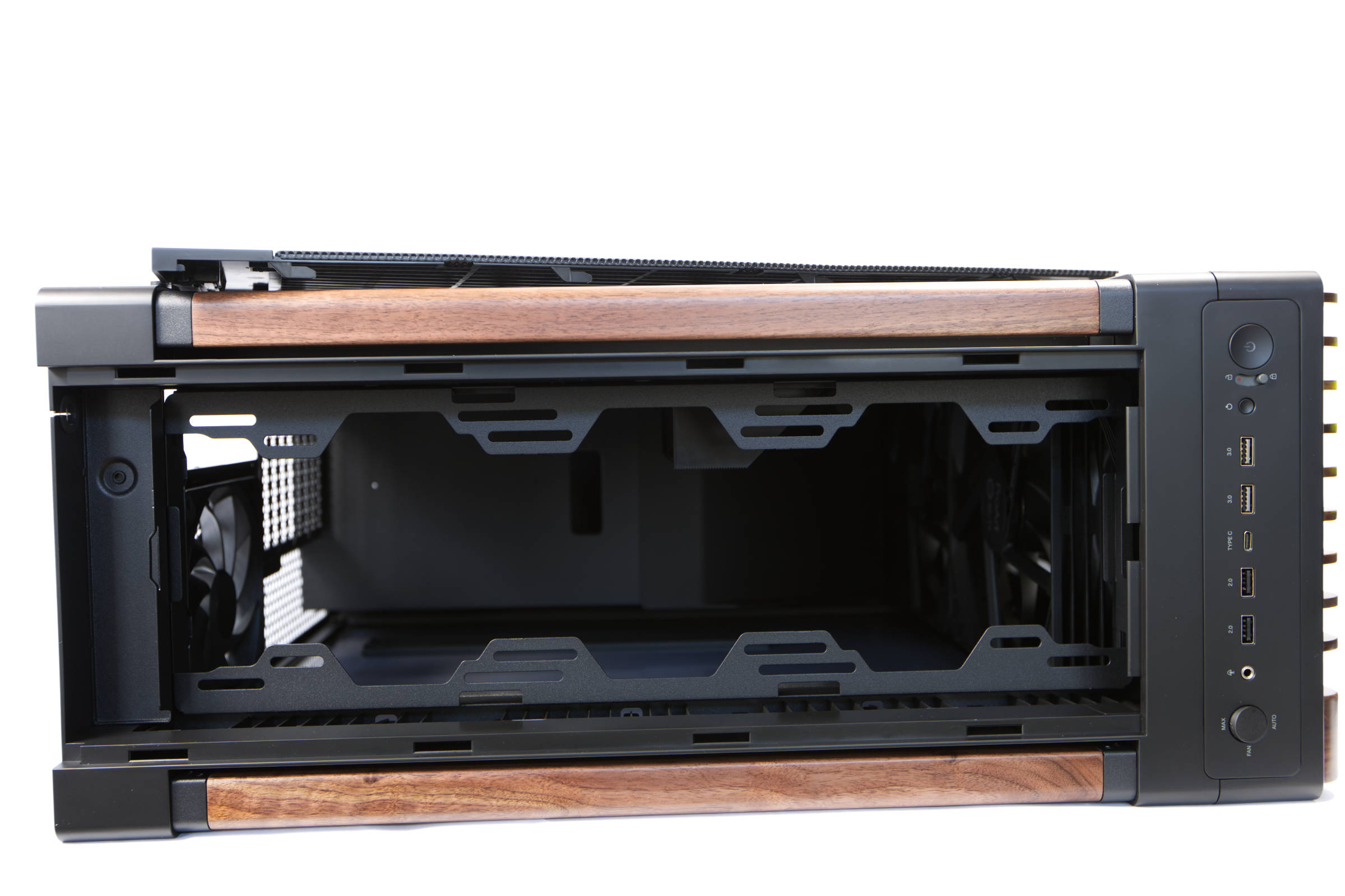 Besonders markant umgesetzt ist die Front, wo die Holzelemente als Blickfang dienen und man erst beim genauen Hinsehen die schwarzen ProArt-Elemente dahinter erkennt, die wiederum die beiden massiven 200 x 38-mm-Lüfter verstecken.