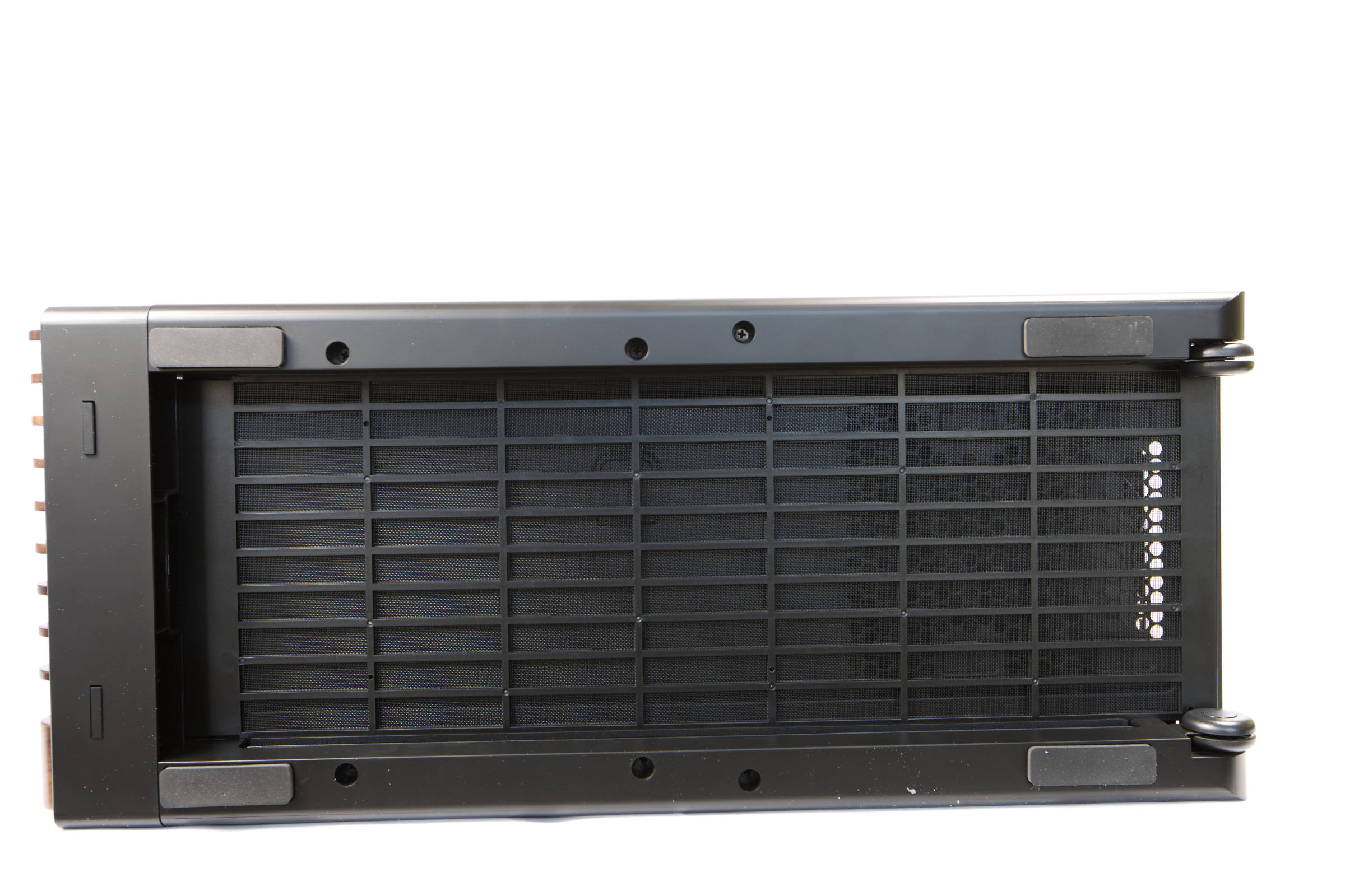 Auf den Rahmen können Radiatoren mit 120 mm bis hin zu 360 und 420 mm angeschraubt werden. Es gibt dafür entsprechend Befestigungslöcher, die auch noch Platz zum Bewegen hergeben. Da der Rahmen herausnehmbar ist, kann man den Radiator sehr komfortabel samt Lüftern außerhalb des Gehäuses darauf schrauben und den assemblierten Rahmen dann in das Gehäuse packen.