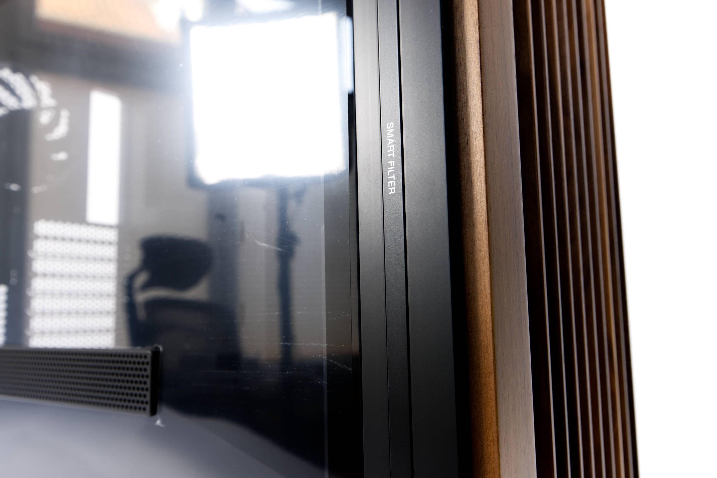 Doch das ist noch nicht alles, denn die Extras werten das Gehäuse für uns noch deutlich auf. Das modulare Design des Gehäuses ist super, was den Einbau erleichtert, doch auch das wirklich gut bestückte I/O-Panel oben ist speziell. Neben den fünf USB-Ports, von denen einer USB 3.2 Type 2x2 mit Type-C ist, gibt es einen blockierbaren Power-Button und einen Lüftersteuerungsswitch mit Auto- und Vollspeed-Modus für Lüfter. Hinzu kommt, dass das große Gehäuse hinten Räder hat, damit man es leicht rollen kann und anstatt eines durchgehenden Glaspanels ist ein Element für den Lufteinlass für Grafikkarten eingebaut. Dazu ist in der Front ein Staubsensor eingebaut, was wir so noch nirgends gesehen haben. Für manche Käufer wird auch das Echtholz an der Front und oben ein Kaufargument sein. Die Verarbeitung ist gut und es gibt wenig zu meckern.