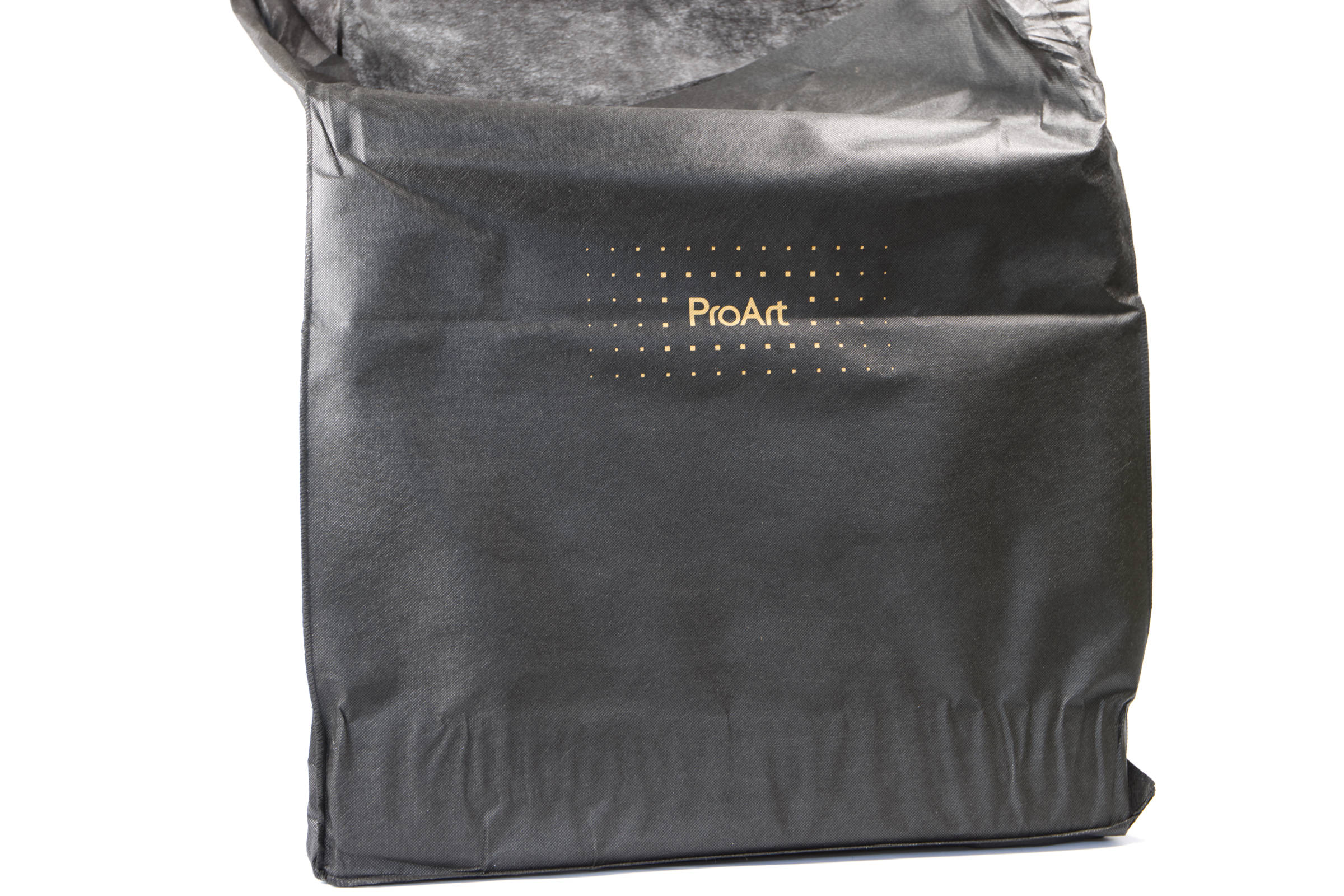 Das Gehäuse wird anstatt in Plastikfolie in einer schwarzen Tasche gehüllt, die auch den ProArt-Schriftzug aufweist. Dies verleiht dem Ganzen einen besseren Eindruck beim Auspacken und fühlt sich wertiger an.