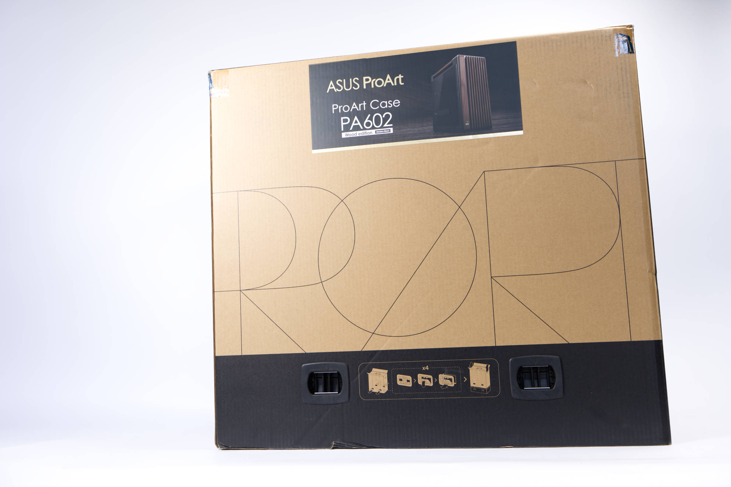 Müssten wir die Verpackung und Umsetzung des ProArt PA602 in einem Wort zusammenfassen, würden wir “erstklassig” sagen. Der Karton ist zwar riesig, doch er schützt das Gehäuse enorm gut. Hinzu kommt, dass man den Karton aus zwei Teilen besteht, die miteinander über vier Plastikstücke verbunden sind. Derartige Fixierung kennt man sonst von großen Fernsehern. Ansonsten ist die Verpackung schlicht und besteht aus dicker Pappe. Wir finden auf allen Seiten die schlichte Beschriftung, die bei ProArt-Produkten üblich ist. Das Gehäuse ist auf einem farbig bedruckten Aufkleber auf der Seite abgebildet.
