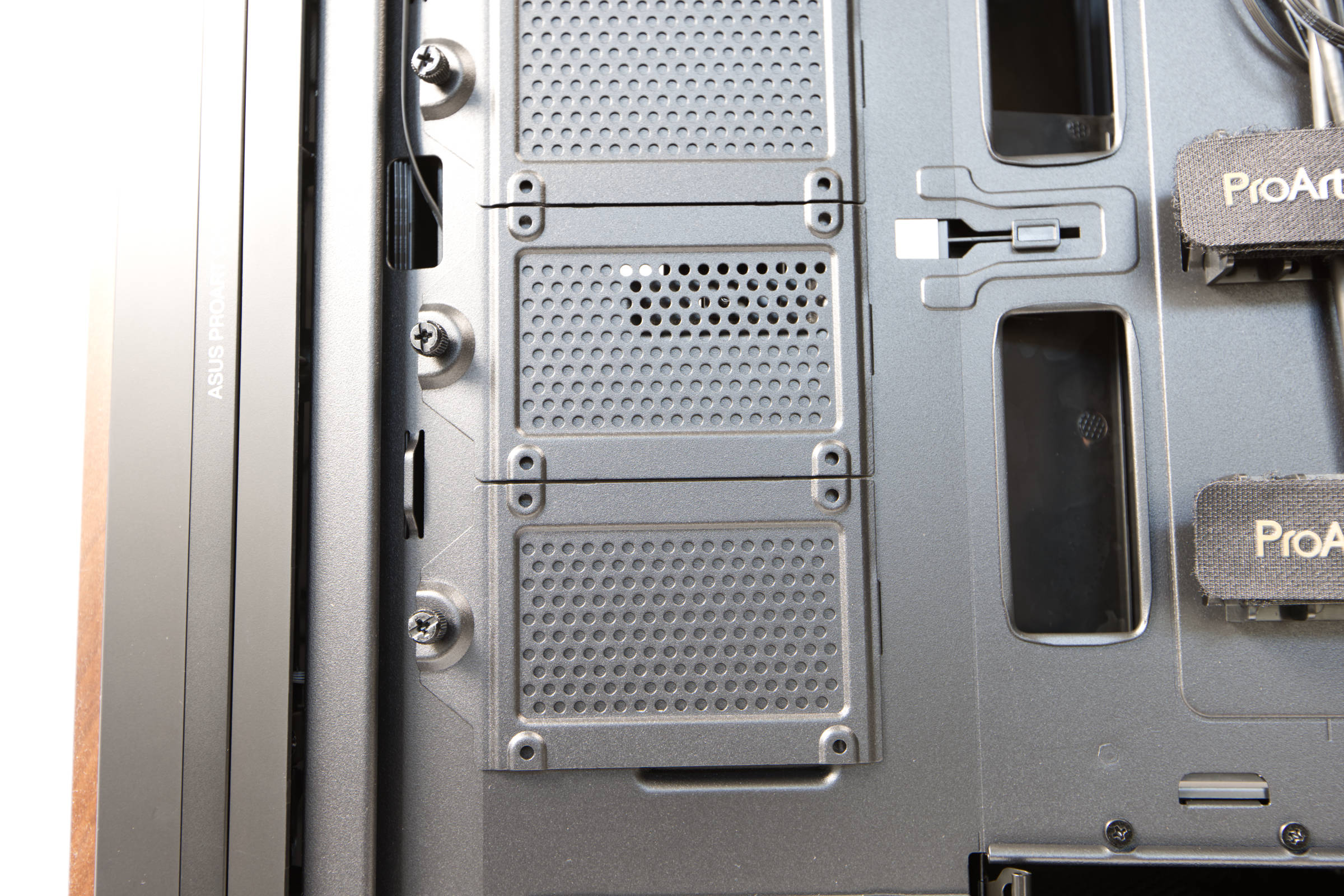 Bei den Montageplätzen für SSDs und HDDs hat ASUS nicht gespart. So lassen sich links auf insgesamt vier einzeln abnehmbaren Rahmen 2,5"-SSDs oder HDDs montieren. Die Positionierung ist gut gewählt, da die Kabel hier leicht verlegt werden können.