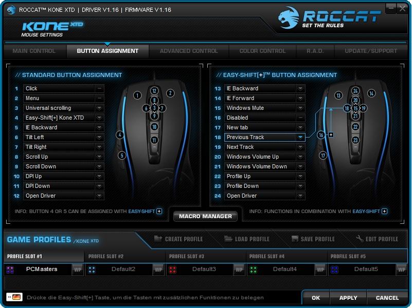 Der Treiber lässt sich simpel auf der Roccat Homepage (unter dem Reiter "Support") finden und installieren. Ist das erledigt, erhält man eine Oberfläche im Roccat-Stil, die in sechs Tabs gegliedert ist. Den Anfang machen die allgemeinen Einstellungen zu dem Mausrad und der Mausgeschwindigkeit. Neben den vertikalen und horizontalen Scroll-Geschwindigkeiten, lassen sich auch Änderungen an den DPI-Größen vornehmen und die Sensitivität des Mauszeigers einstellen. Danach folgt die Tastenbelegung der Roccat Kone XTD. In diesem Menüpunkt lassen sich neben den normalen Tastenbelegungen auch die Easy-Shift [+] Einstellungen vornehmen. Was an dieser Stelle angemerkt werden muss ist, dass Roccat eine Menge an Voreinstellungen für die Makros zur Auswahl gibt. Falls einem das nicht genügen sollte, kann man noch auf den Makro Manager zurückgreifen um eigene Makros zu erstellen. Der dritte Tab befasst sich mit erweiterten Einstellungen. So kann man hier nochmals die Sensitivität des Sensors, Getrennt für X- und Y-Achse vornehmen, oder die TDCU (Tracking and Distance Contol Unit) einstellen aber auch Sound aktivieren oder deaktivieren, denn die XTD gibt einem die Möglichkeit Änderungen der Einstellungen, mittels Knopfdruck an der Maus, akustisch bestätigen zu lassen.