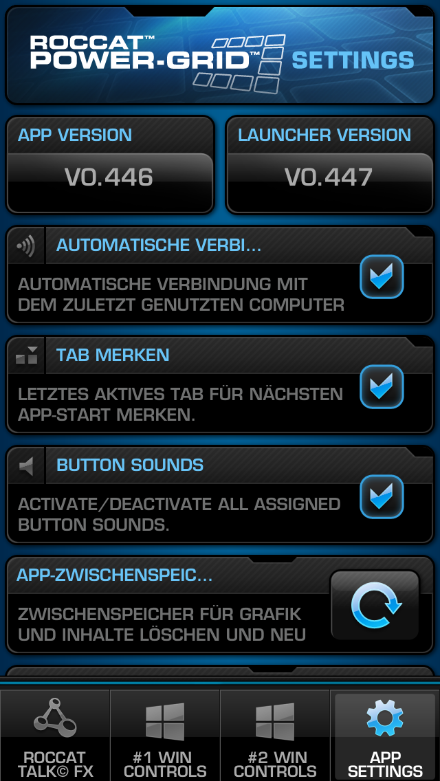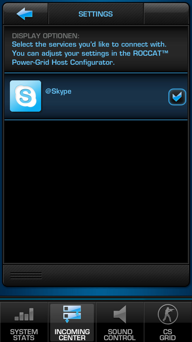 Der erste Tab, die „System Stats“, befasst sich mit Auslastung des Prozessors sowie des Arbeitsspeichers, Festplattenkapazität und Netzwerkauslastung. Darauf folgt dann das „Incoming Center“, welches vom Nutzer individuell für Soziale Netzwerke wie Facebook und Twitter aber auch für Voice-Programme wie Skype oder Teamspeak genutzt werden kann. Als drittes folgt ein Tab zur Steuerung der Musik. Das Schöne an dieser Stelle ist, dass man Lautstärken für allerhand Wiedergabestellen manuell regeln kann. Die App differenziert beispielsweise zwischen Master, Windows Media Player, Firefox und dem Adobe Flash Player. Laut Rücksprache mit Roccat arbeitet man momentan noch daran, dass in Zukunft jegliche Soundquellen von der App erkannt werden und separat geregelt werden können. Als letztes kommt der „App Settings“-Tab. Dort nimmt man Einstellungen zum Verhalten der App vor. Sei es nun eine „Automatisch verbinden“-Funktion, die es ermöglicht die App beim Starten automatisch mit dem Rechner zu verbinden; eine „Tab merken“- Funktion, um zum letzten aktiven Tab zurückzukehren, wenn man die App startet; Einstellungen zum Browser oder die Helligkeit des Smartphones zu ändern. Neben diesen Standard Applikationen, bietet Roccat bereits zum Start diverse weitere Funktionen, um die Power-Grid App sinnvoll zu nutzen, diese müssen in Zusammenarbeit mit dem PC Programm heruntergeladen, und installiert werden. Welche Apps es bereits gibt und wie man diese Installiert erklären wir nachfolgend unter den Punkten „Treiber“ und „Praxis“.